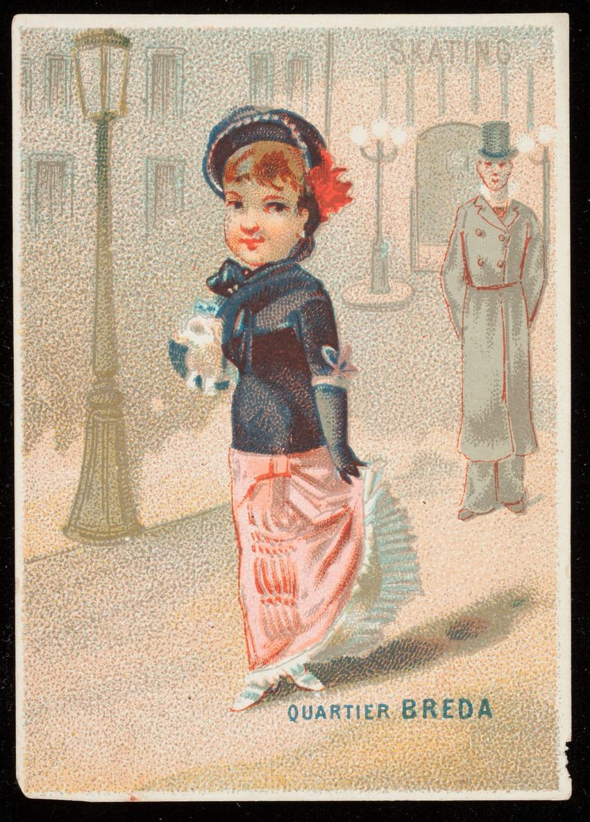 Quartier Breda was frequented by prostitutes and courtesans. The upper right corner of the card has the work "Skating."