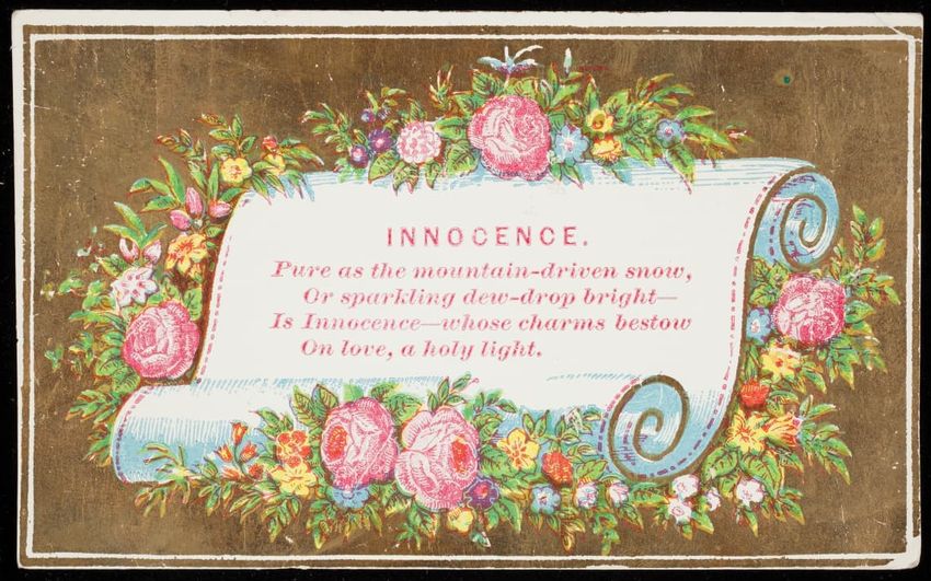 Flowers frame the scroll with the innocence proverb. "Pure as the mountain-driven snow, or sparkling dew-drop bright-is innocence-whose charms bestow on love, a holy light."