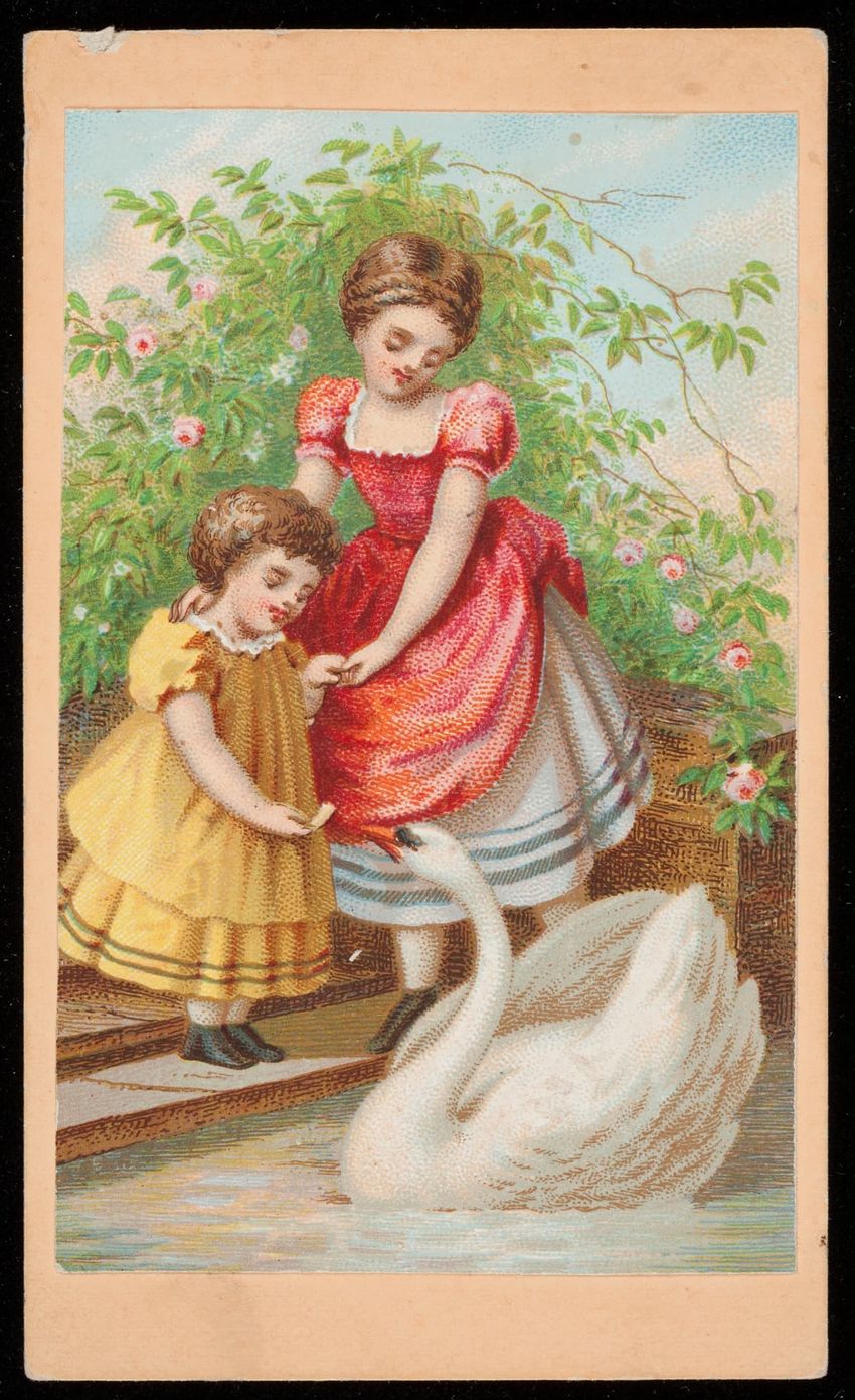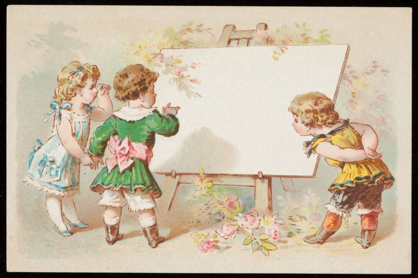 Trade card, three children stand in front of a blank easel, location unknown, undated
