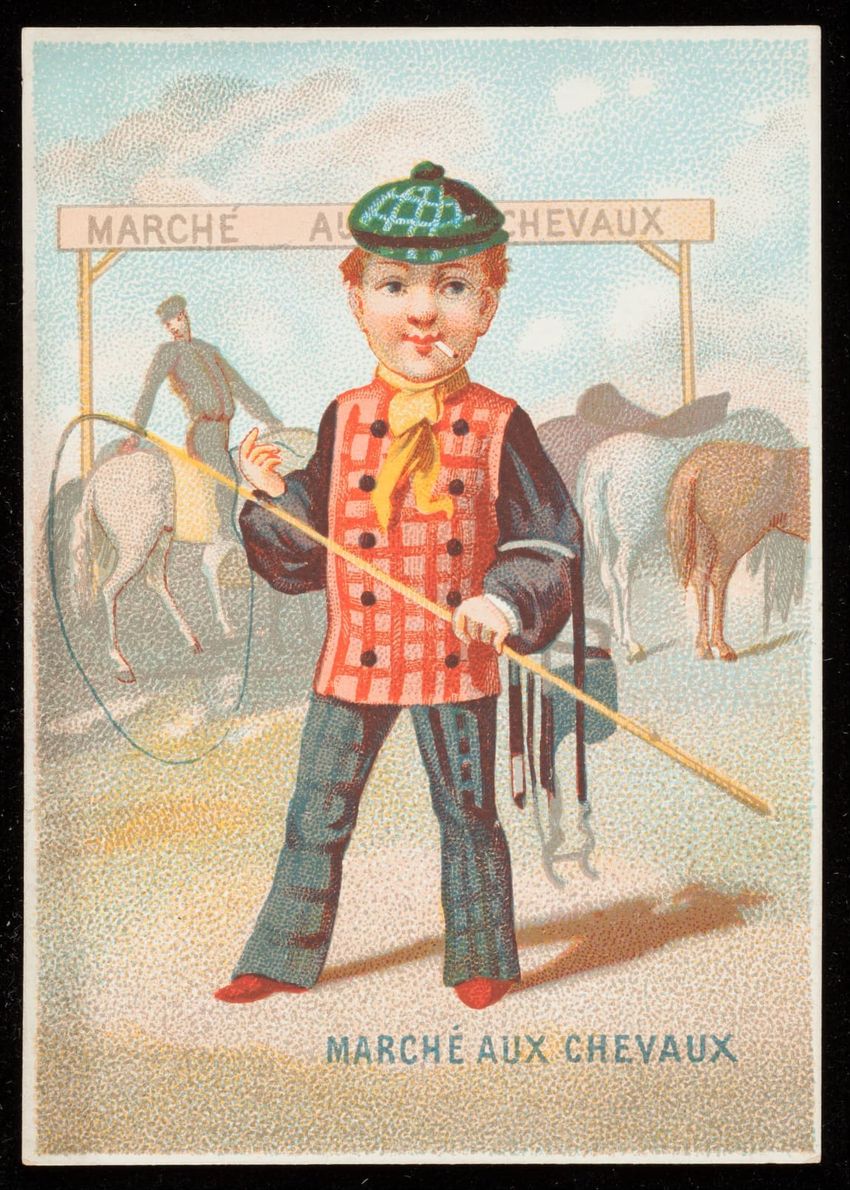A young boy, with a cigarette in his mouth, holds a whip and a bridle with the Paris horse market in the background.