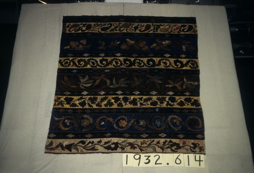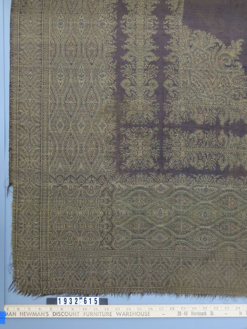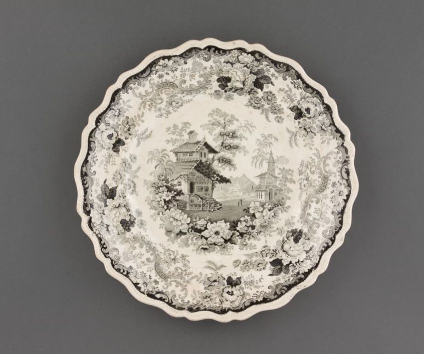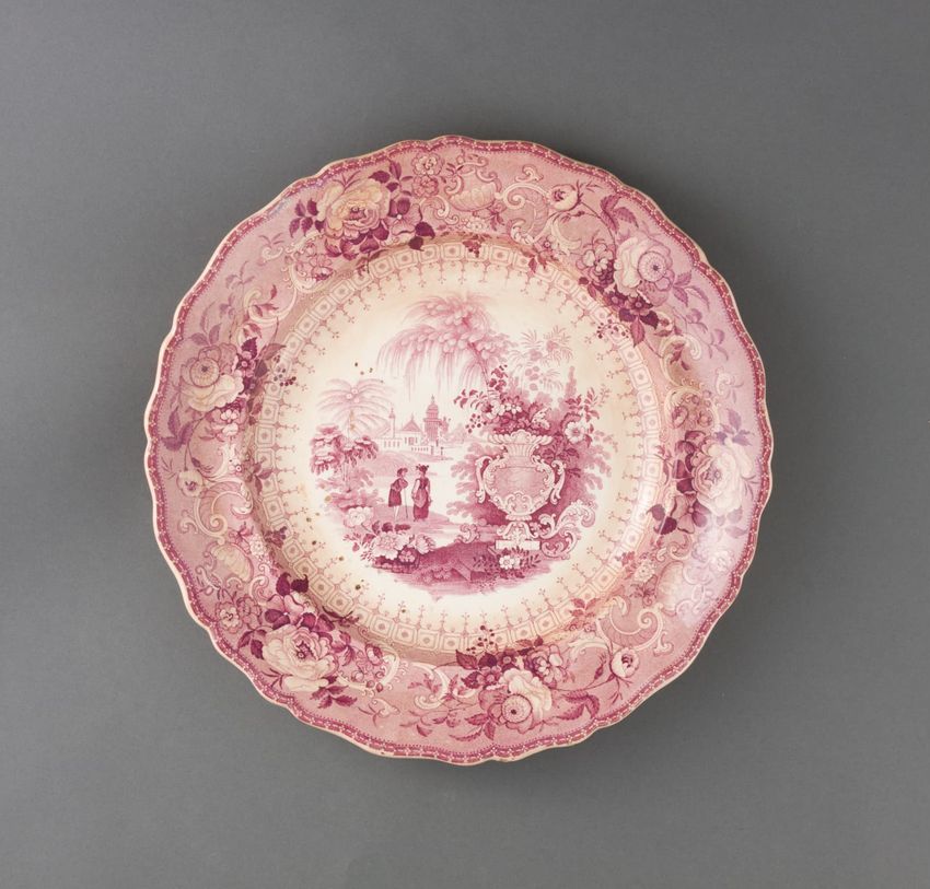 Earthenware soup plate with scalloped edge. Transfer-printed pattern "Ancona" in mulberry. Border of roses and scrolls; scene of large, white urn, right foreground; man and woman on shore, left foreground; buildings beyond; all wreathed in flora.