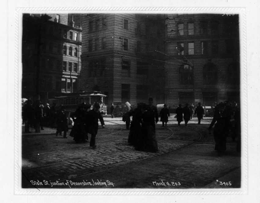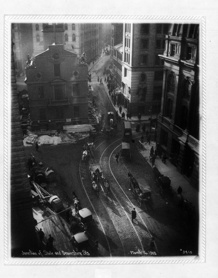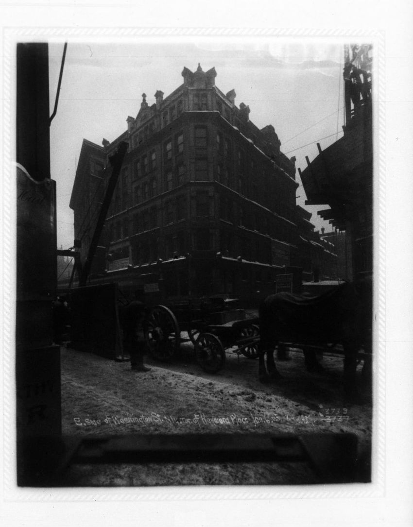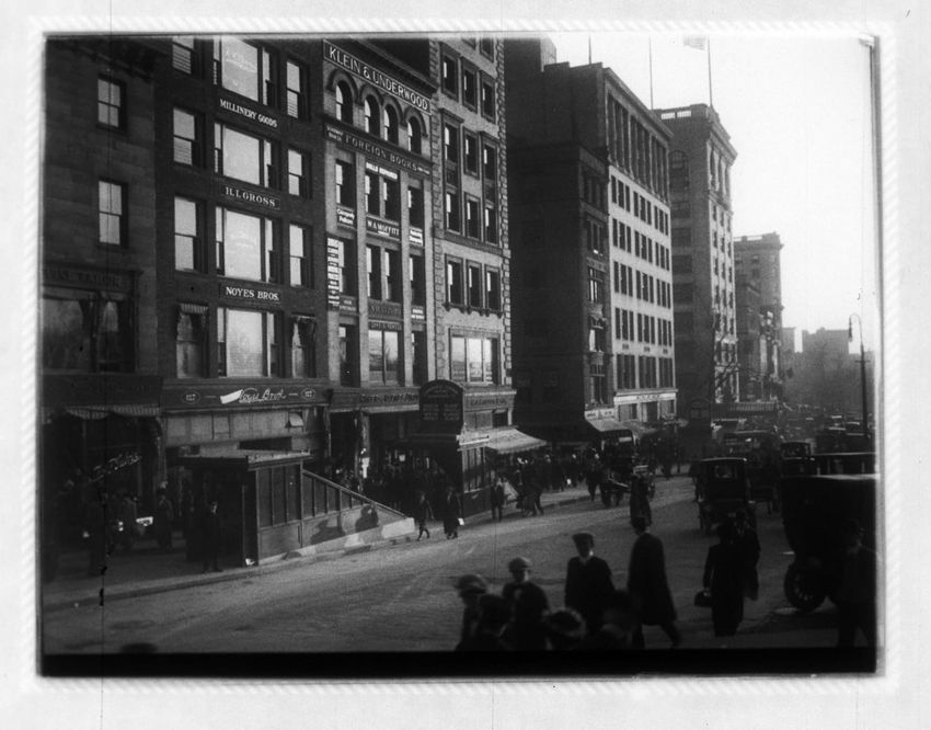 A sign at the top of the building can be seen for Eugene A. Holton, photographer, at 8 Summer Street. Noyes Bros., men's furnishings including golf clubs, is at street level at 4 Summer Street. A sign for Talbot Clothing at 395-403 Washington Street is on the left side of the image.