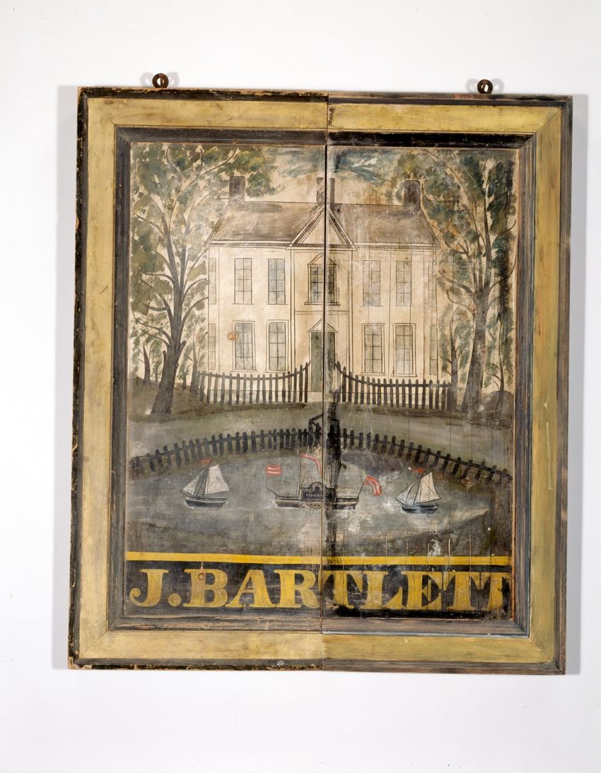 A heavy rectangular board, with a heavy three-part molding frame. Painted on both sides: one side has two large white houses with two sailboats and a side wheel steamer, "Liberty" in front of a house. On the reverse is an engine and string of carriages entering a station; ships in the foreground. Co...
