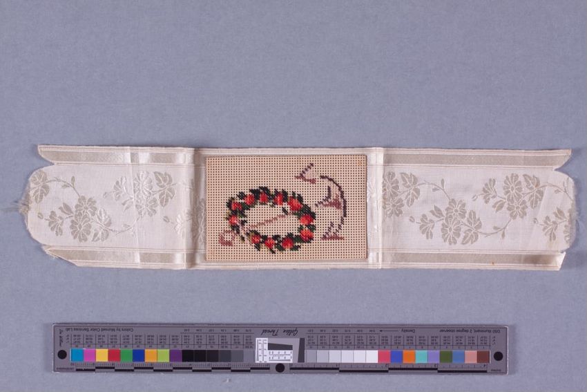 White printed w/ red paisley and dotted pattern; lace at neckline and sleeves w/ fine mull undersleeves; shirred bodice w/ skirt gathered all around onto waistband; piping at neckline, armseye and waist; 2 tucks at hem, w/ hook and eye closure; bodice lined w/ white cotton.
