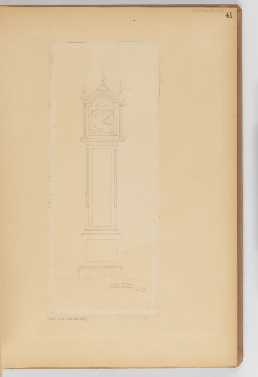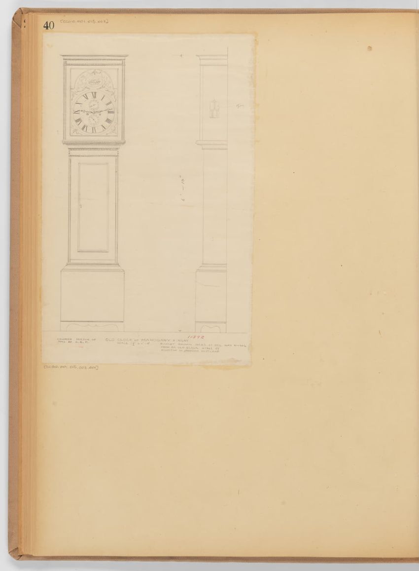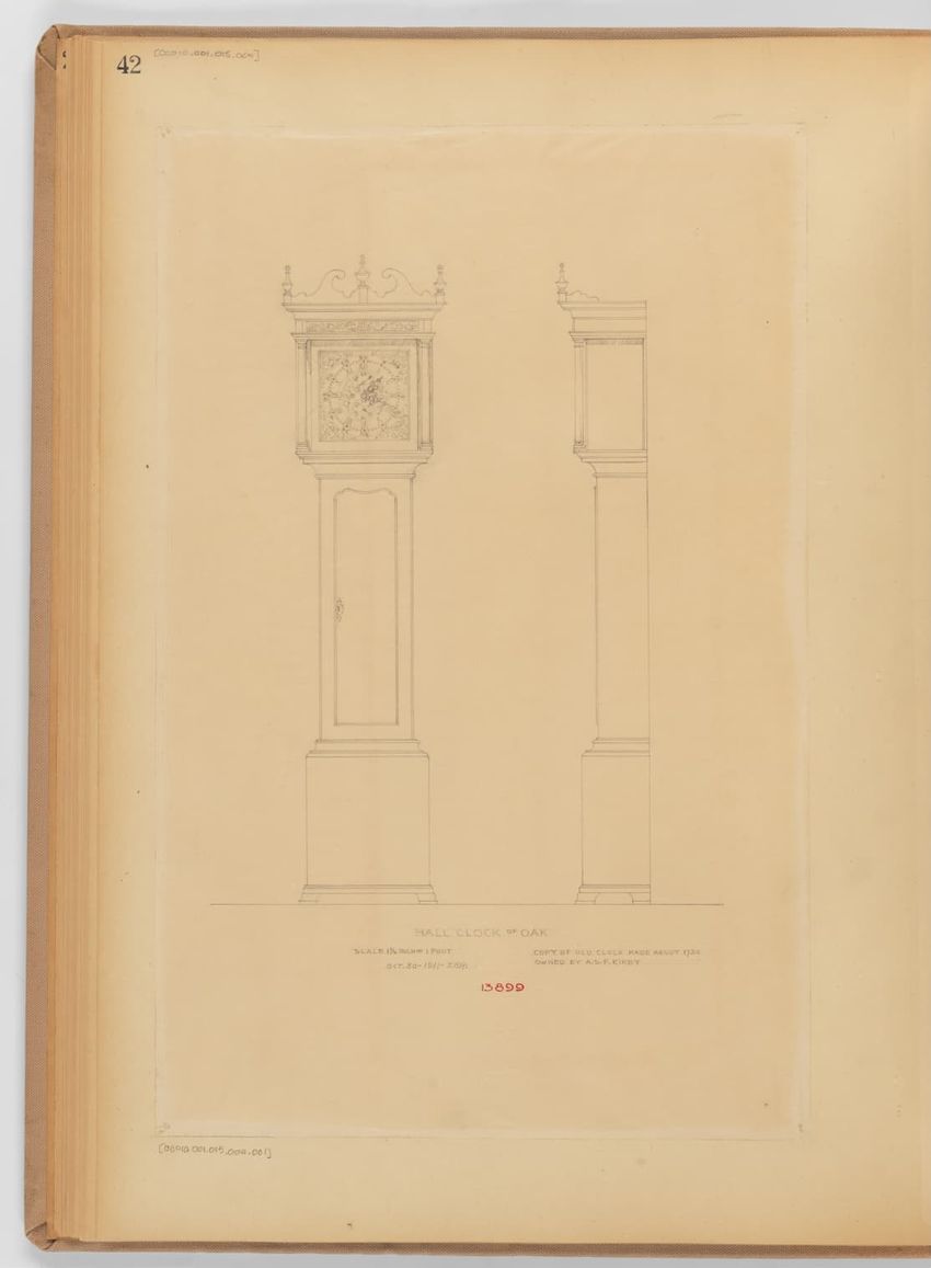 Design drawing titled "Hall Clock of Oak" rendered in pencil on trace. Front and side views are shown. Tall case clock has bonnet with a broken arch pediment, three spike finials, carved frieze, and plain hood columns; waist section with recessed center panel; plain base; and bracket feet. Title, sc...
