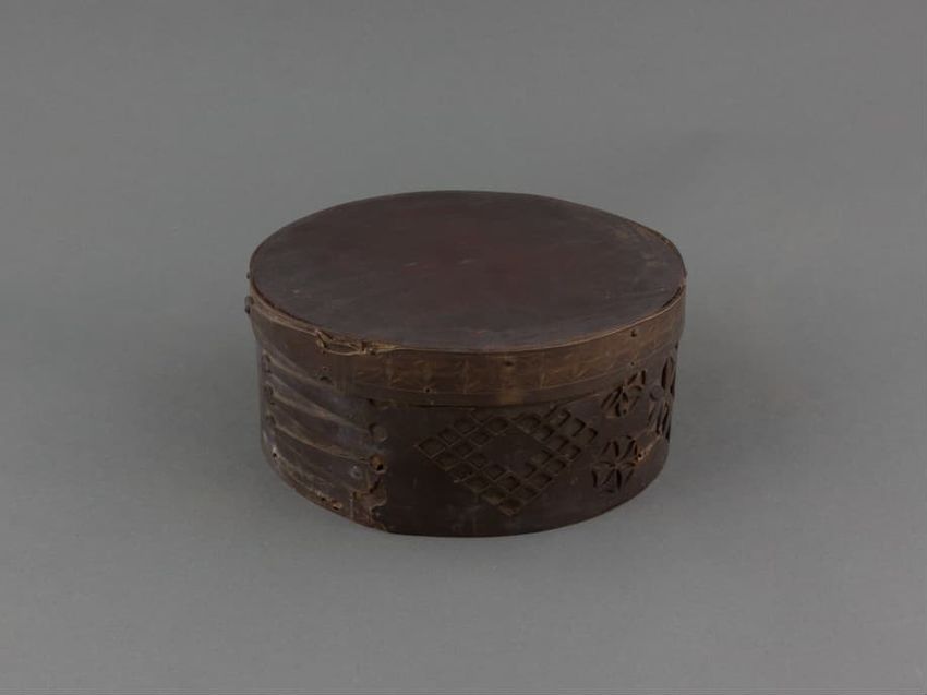 Small round box with cover. Top of cover and base of box are dark stained wood. Sides of box and cover are made of carved and pierced baleen.