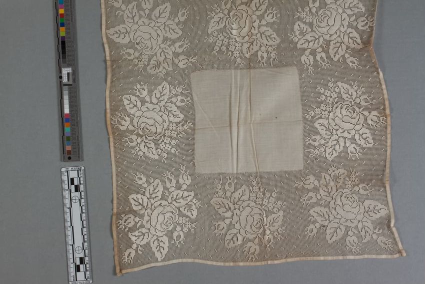 Cream/discolored; knitted lace; two chevron bands, with openwork bands; large star motif at back.