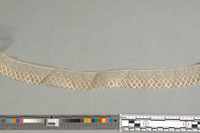 Small, footed earthenware bowl with "flow blue" transfer-printed pattern "Scinde." Floral border around interior rim. Repeating scene of flowering tree surrounded by water, a figure carrying a flag toward a pagoda on exterior and interior basin.
