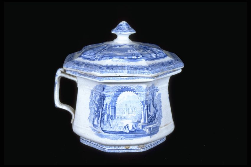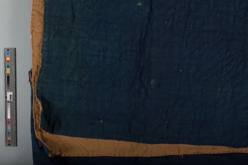 Square rug with striped outer border; two inner borders of boxed "X"s and short diagonal stripes and square field of four flowerheads; worked in shades of brown, red, pink, blue, beige, and green in wool and cotton burlap foundation.