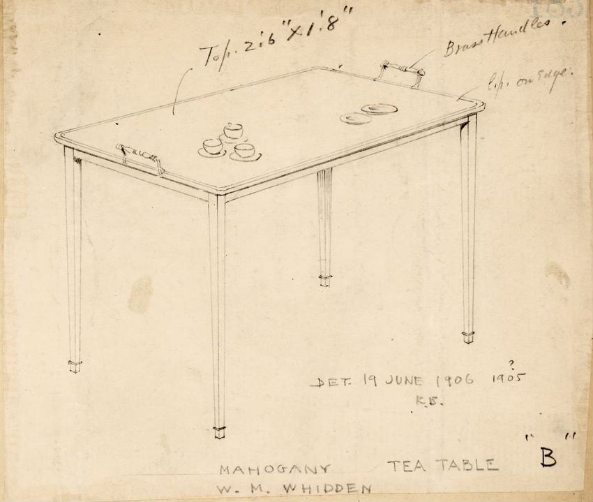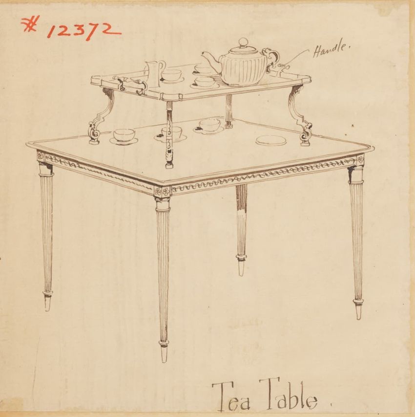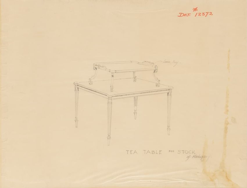 Untitled design drawing of a sofa rendered in pencil on trace. Perspective view is shown. Large upholstered sofa has rectangular back; rounded arms; tufting on back, arm and seat upholstery; single row of metal tack trim along bottom edge of upholstery; and bun feet. Title, design notes, "45122 / De...