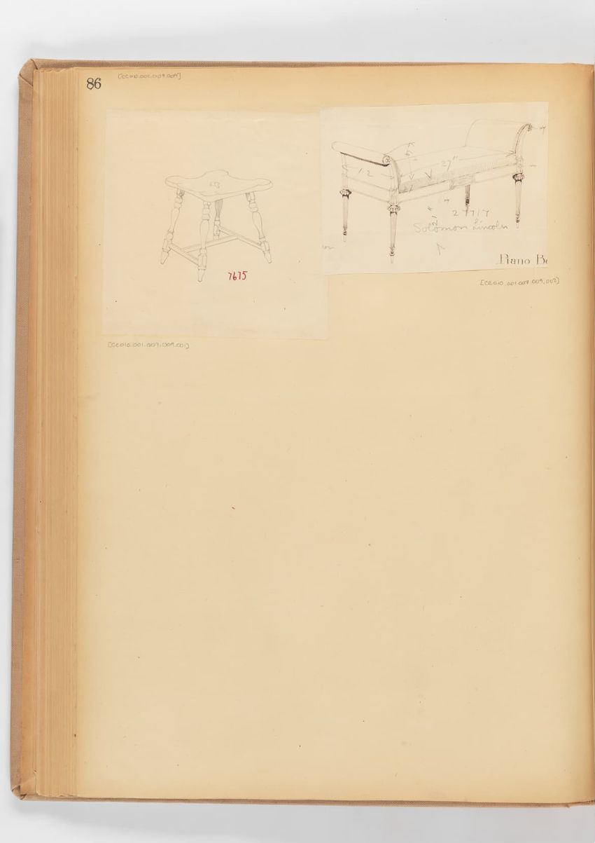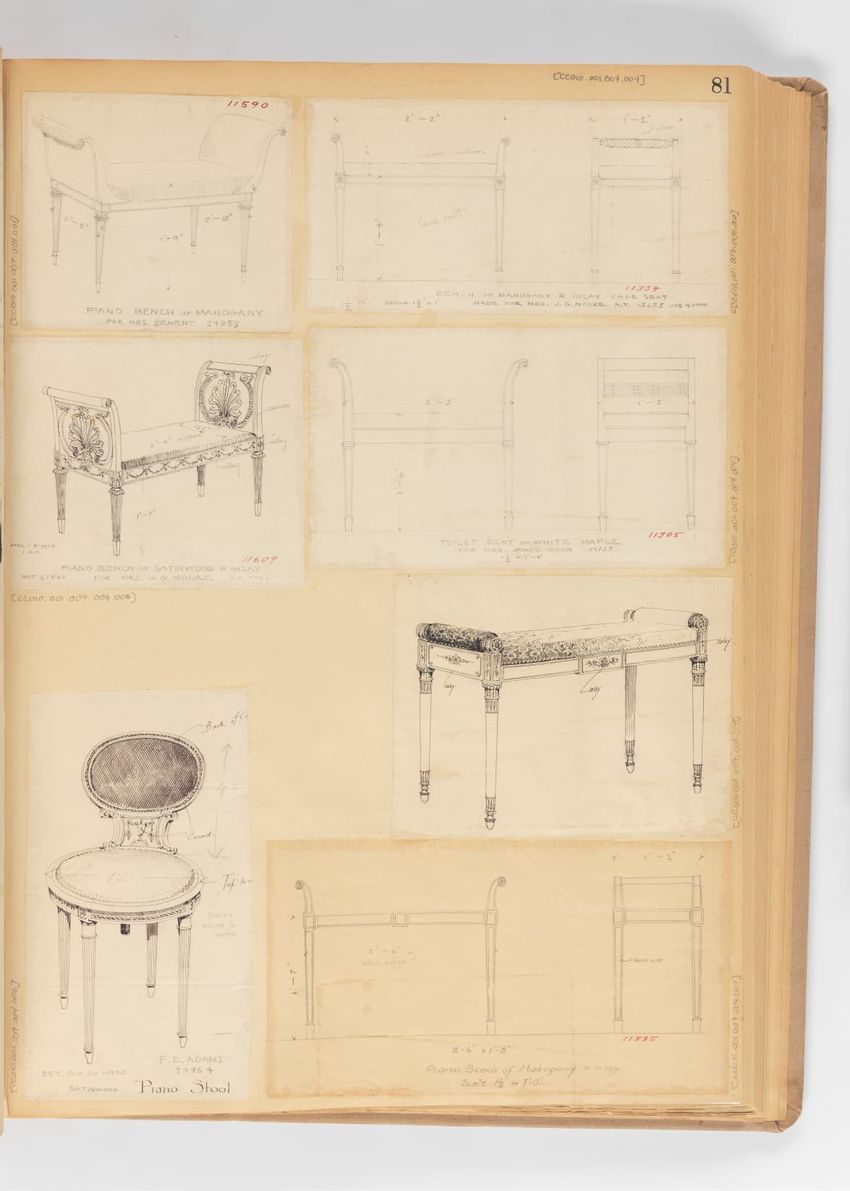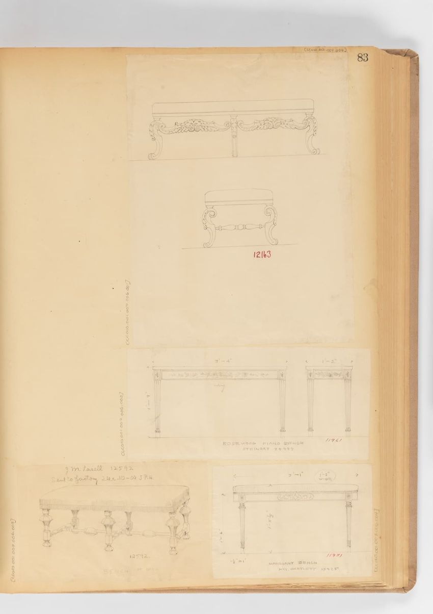 Untitled design drawing rendered in pencil on trace. Drawing depicts various piano details including front view of music stand; front views of side and back legs; and front and side views of lyre-shaped piano support. All pieces incorporate Neoclassical-style elements such as lyre shapes, carved scr...