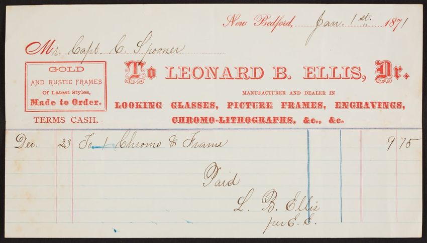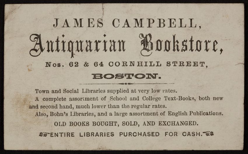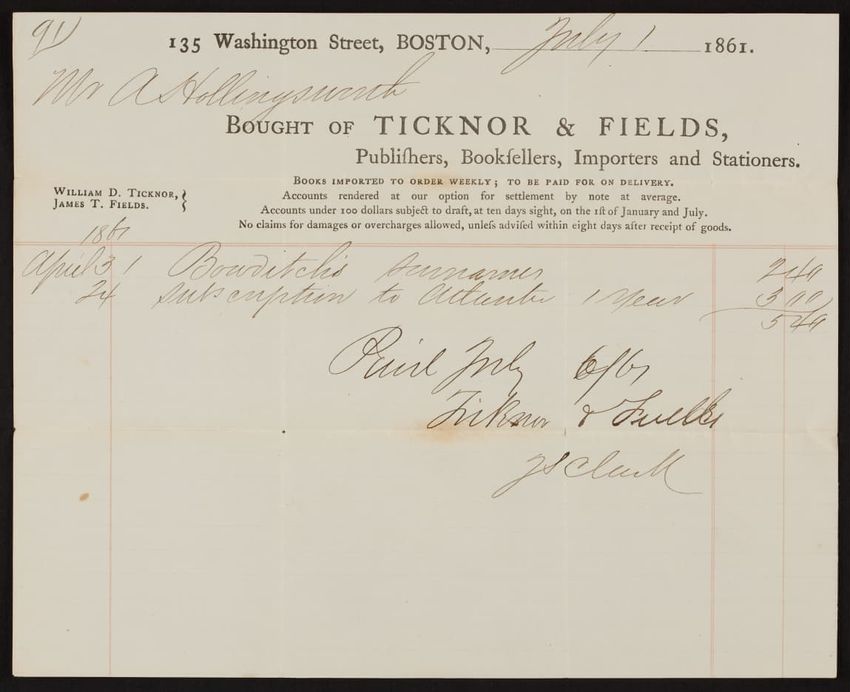 A handwritten receipt listing various items sold at [what appears to be] W. D. Ticknor's, Palm Leaf Mattress, Bunker Hill Monument, Horticultural Exhibition. "W. D. Ticknor's" is probably a reference to the Old Corner Book Store opened in 1832 by William Davis Ticknor, John Allen, and, later, James ...