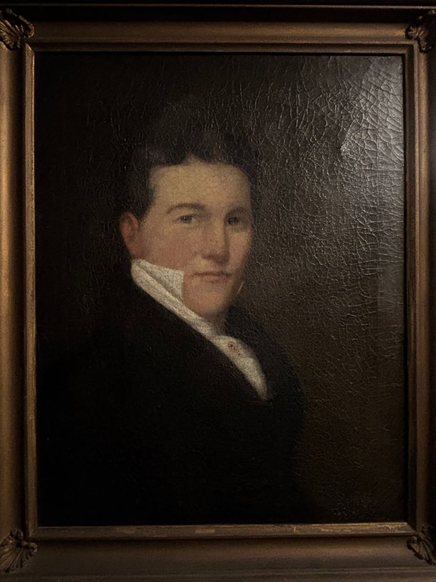 Red with leather strap closure, tan lining, embossed garland border inside, 2 compartments, pencil holder, lined with blue and white marbled paper.