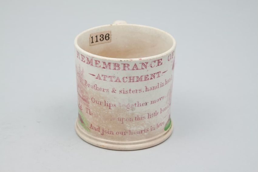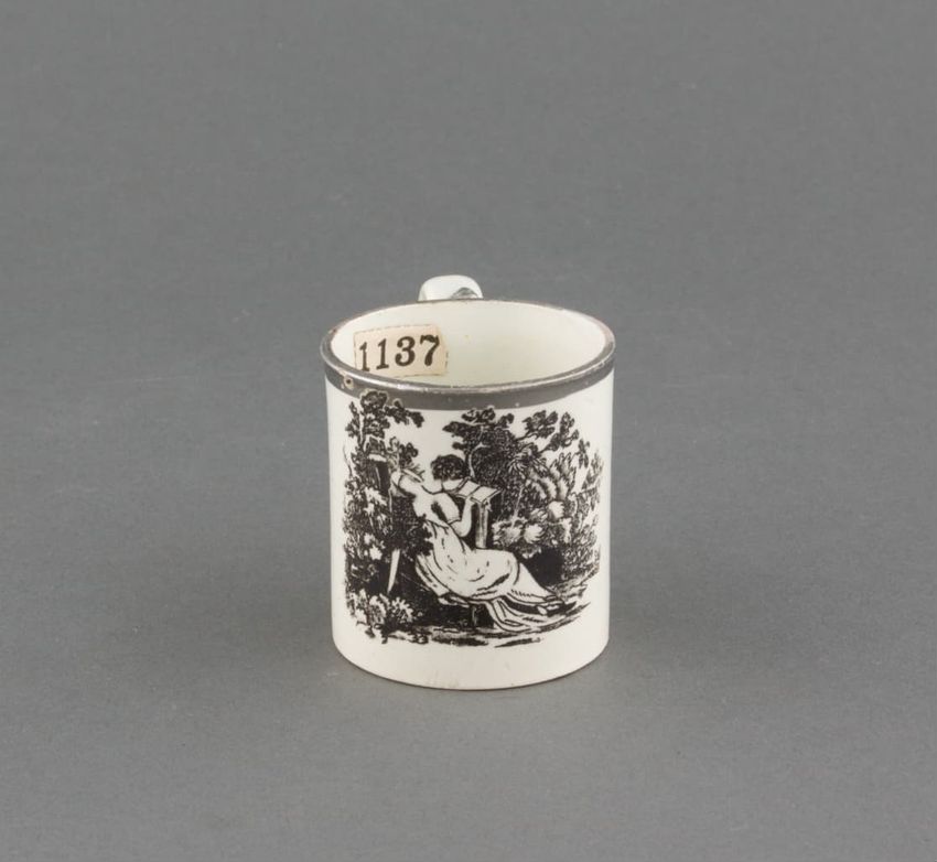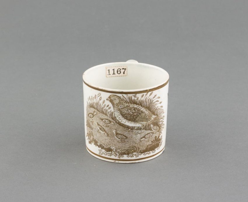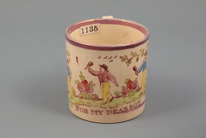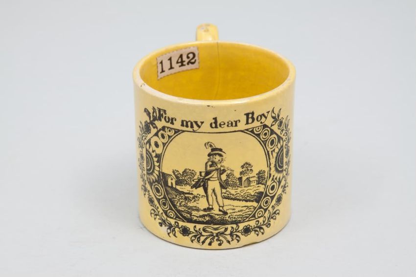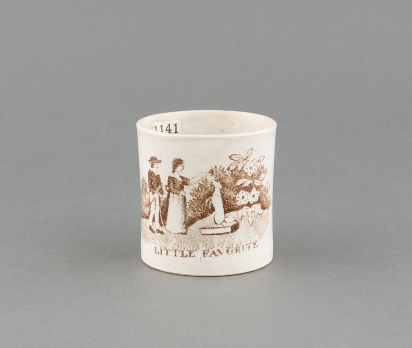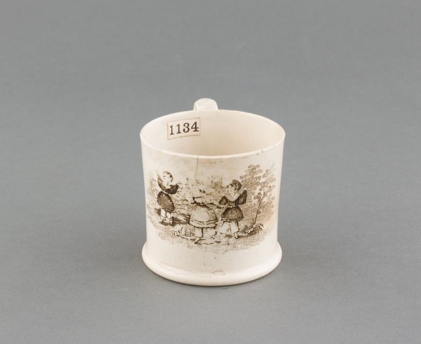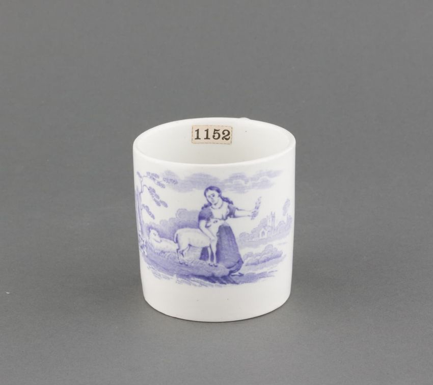 Earthenware children's mug. Blue glazed band around body, with two black transfer printed images. On one side: a dog wearing a collar, lying in front of a hay bale, a shephard's crook, and a hat. On the other side: a horse or donkey, wearing a saddle and harness, with two rounded baskets [?] ...
