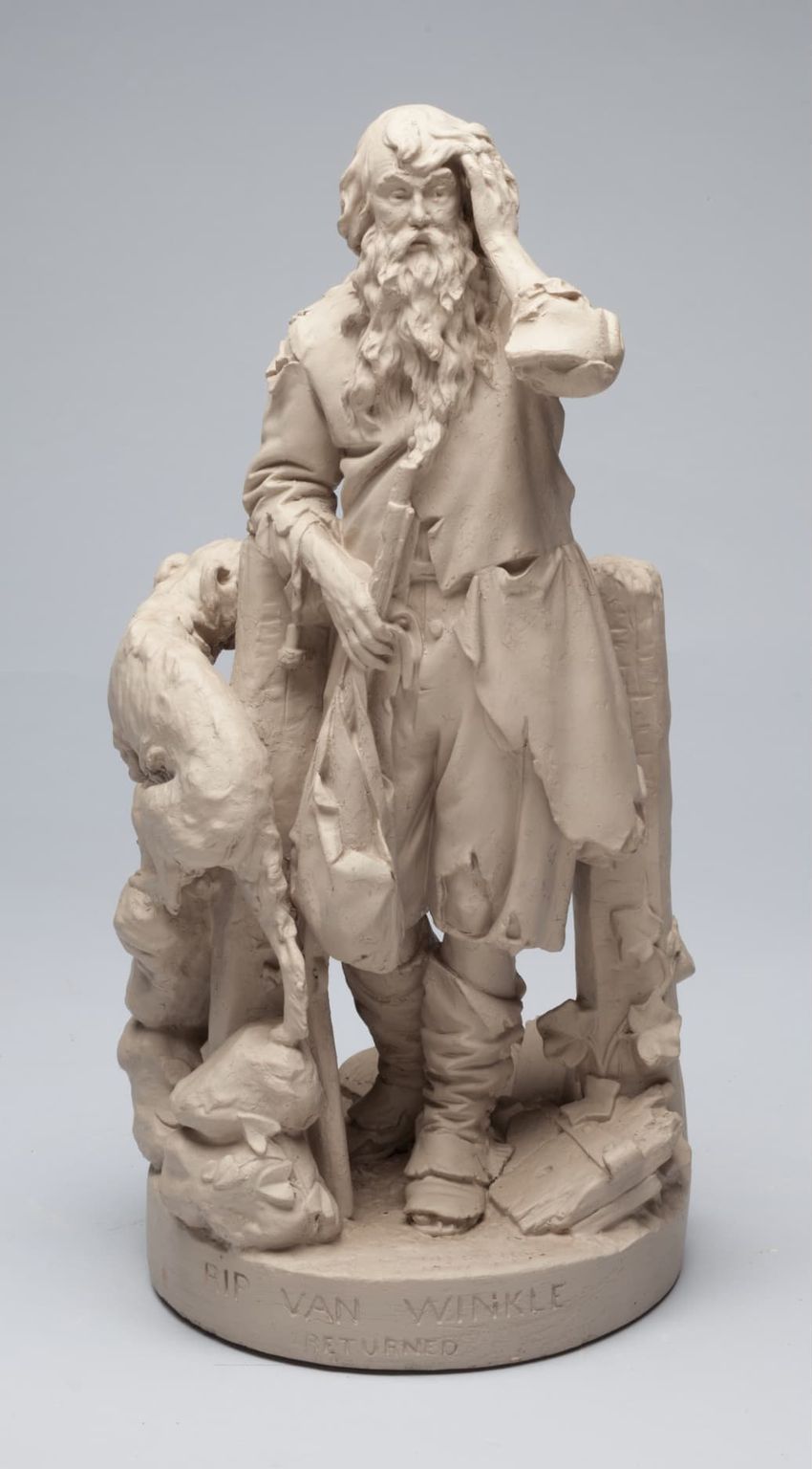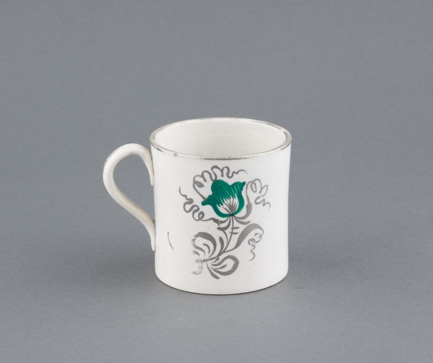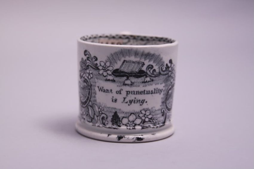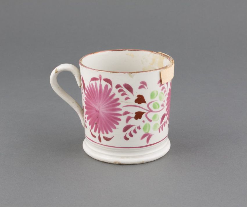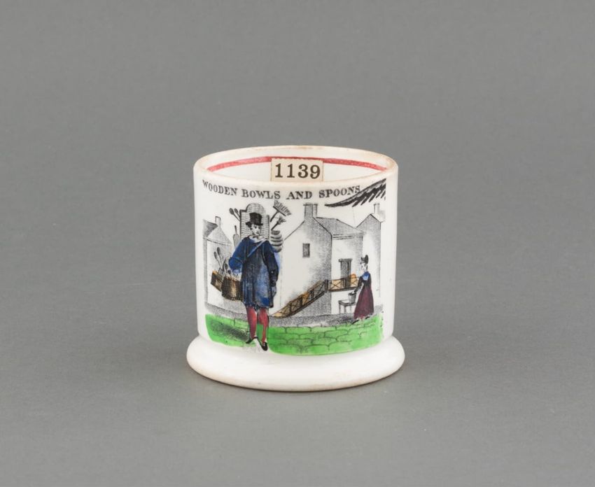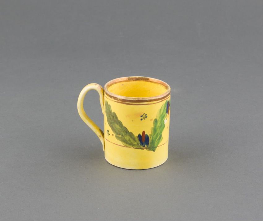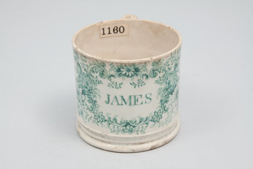 Earthenware children's mug. Blue glazed band around body, with two black transfer printed images. On one side: a dog wearing a collar, lying in front of a hay bale, a shephard's crook, and a hat. On the other side: a horse or donkey, wearing a saddle and harness, with two rounded baskets [?] ...