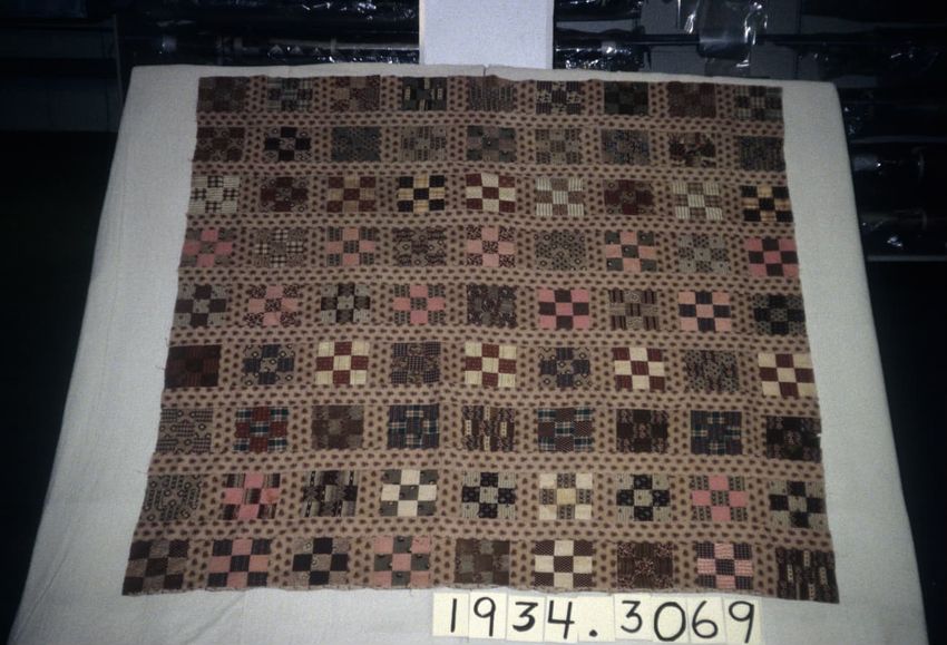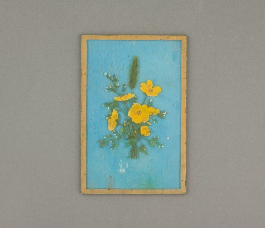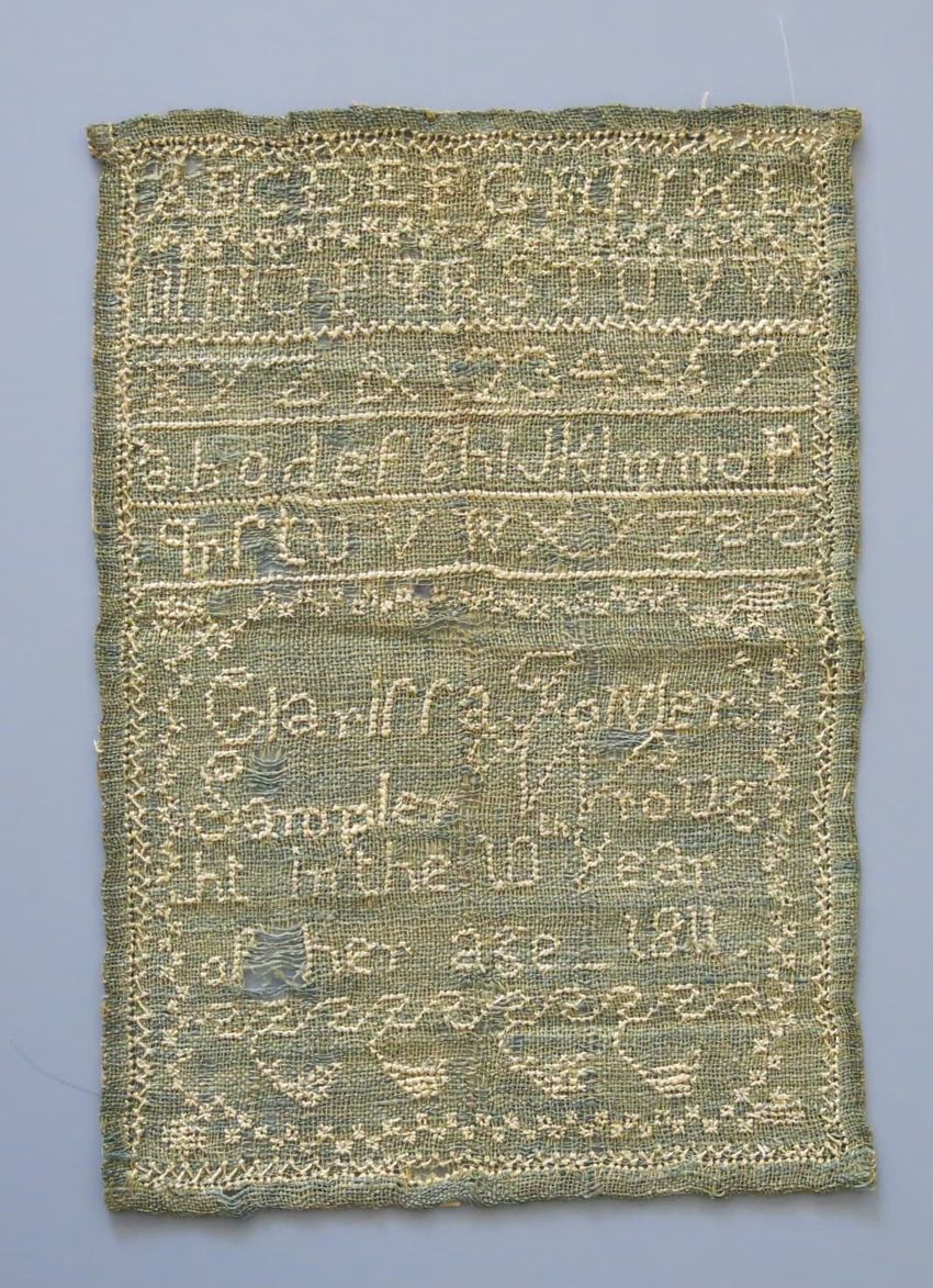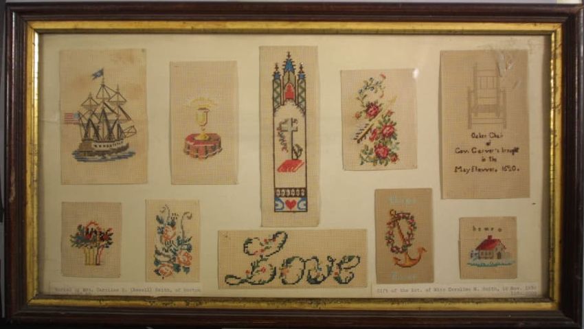 Ten small pictoral needlework samplers framed together. Images depict :Mayflower ship, challis, arrow and flowers, Governor Carver's chair, basket of flowers, flowers, flowers spelling "Love," anchor and wreath, and a house. Silk and wool on bristol board.