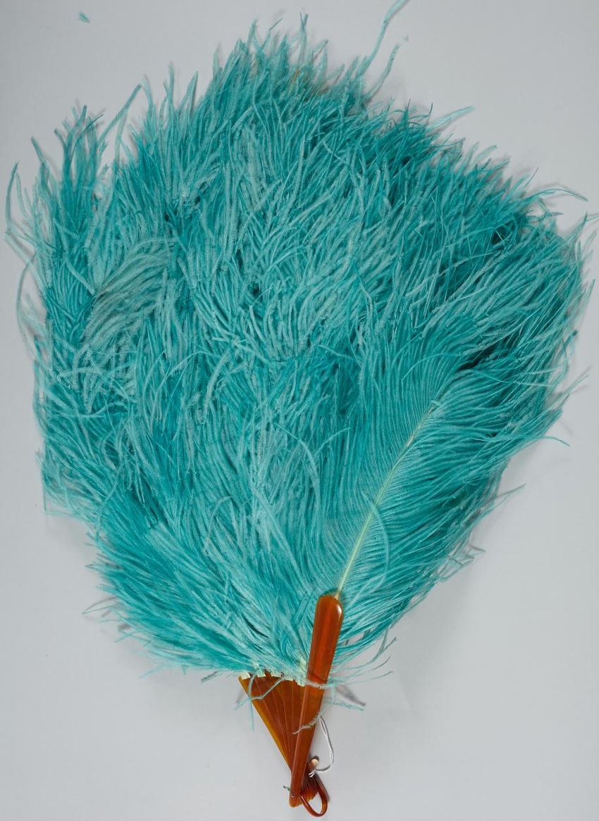 Fan with teal blue ostrich feathers with brown plastic sticks and hail handle.