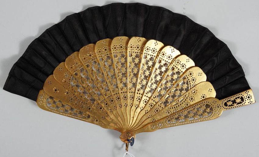 Gilded, pierced sticks and guards; edged with black moire' leaf; carved metal ring.