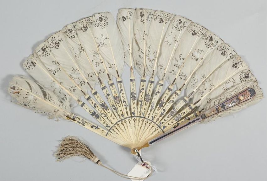 Pierced and carved ivory sticks; inlaid with silver; overlay of mother of pearl on guards, pierced, carved and inlaid with silver; short white feather leaf painted with silver (design worn away); mother of pearl washer, carved metal ring; white silk cord and tassel.