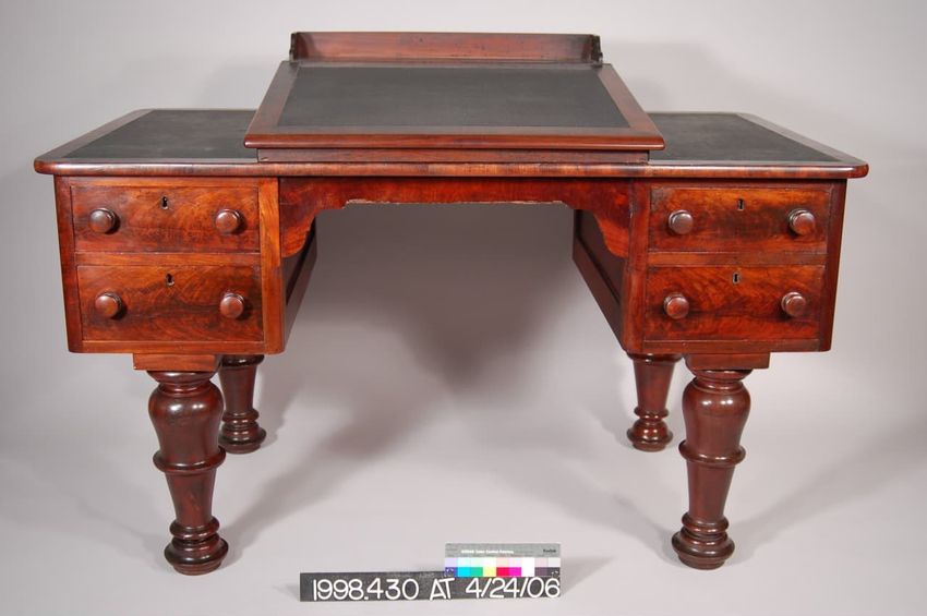 Oil painting of the Tucker's ship, Richard III. The ship had a large black and olive green hull, 3 masts and twenty sails. An American sail flies from the stern of the ship and a red flag reading R III flies from the center mast. At least 3 other sailors; vessels are seen on the water. Frame: 3 1/2 ...