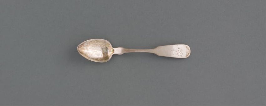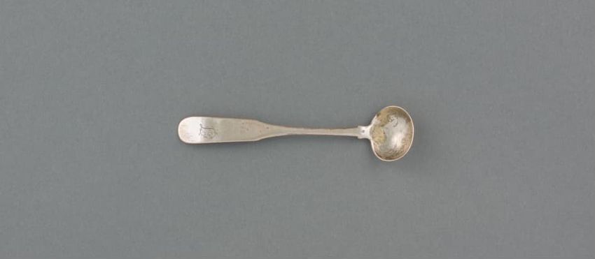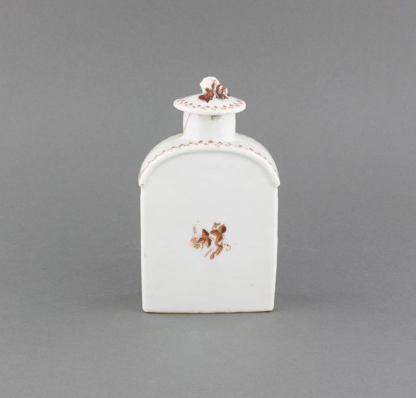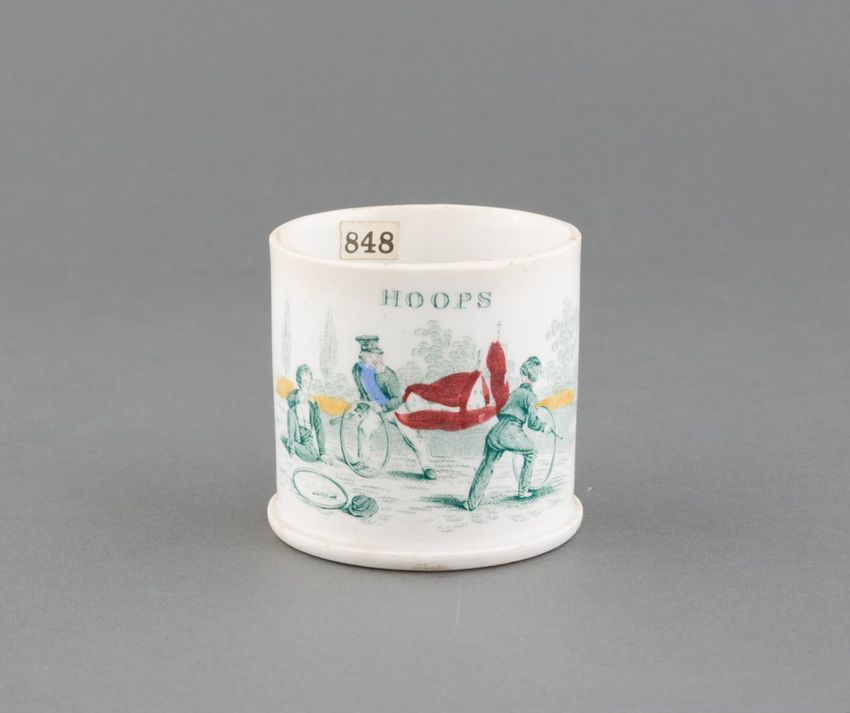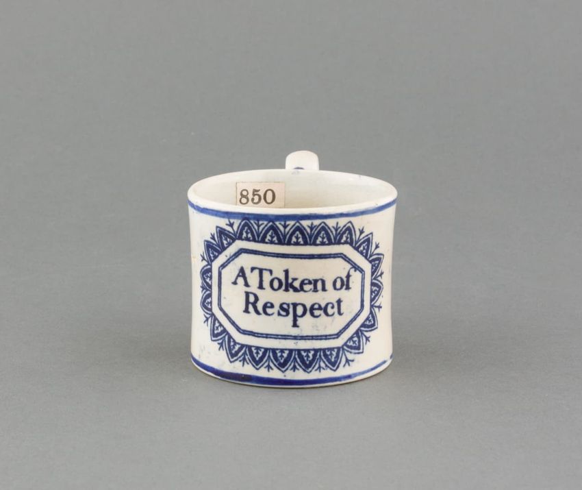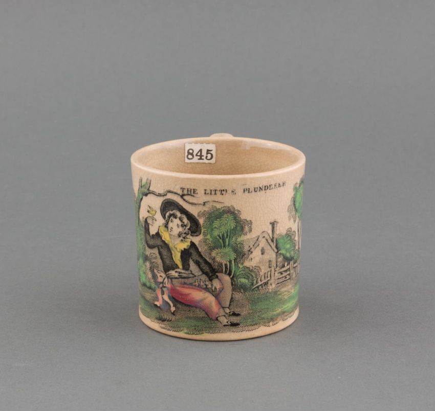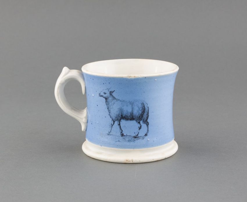 Earthenware mug. Cylindrical with squared, ear-shaped handle. Blue transfer printed landscape with water, an arched bridge, people in boats, and several buildings and sheep. Blue floral border on inside of rim, and blue landscape print on handle.