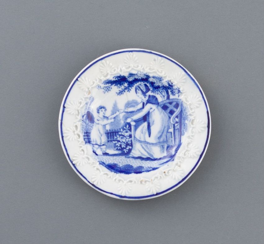 A blue transfer printed pearlware plate. The central design depicts an outdoor family scene surrounded by a molded anthemion border and a blue rim.