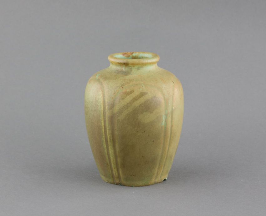 Stoneware vase, light and dark green, Art Nouveau style. Vase has rounded rim, short neck and elongated tapering body.