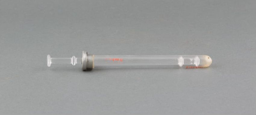 Colorless glass syringe with metal stopper, glass plunger and four small holes on bottom of glass tube.