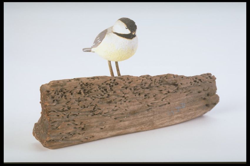 Carved figure of a chickadee painted realistically with metal legs and mounted on a driftwood base.