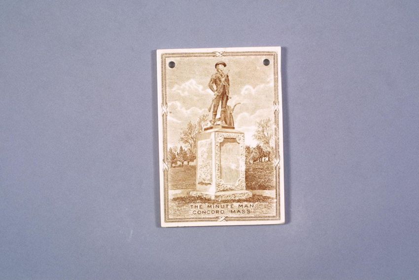 Calendar tile for 1923. Calendar on one side, print depicting the "Minute Man, Concord, Mass" on the other. Small rectangular ceramic tile with two holes drilled in top corners.