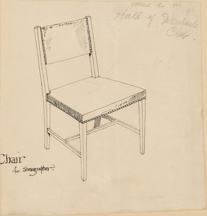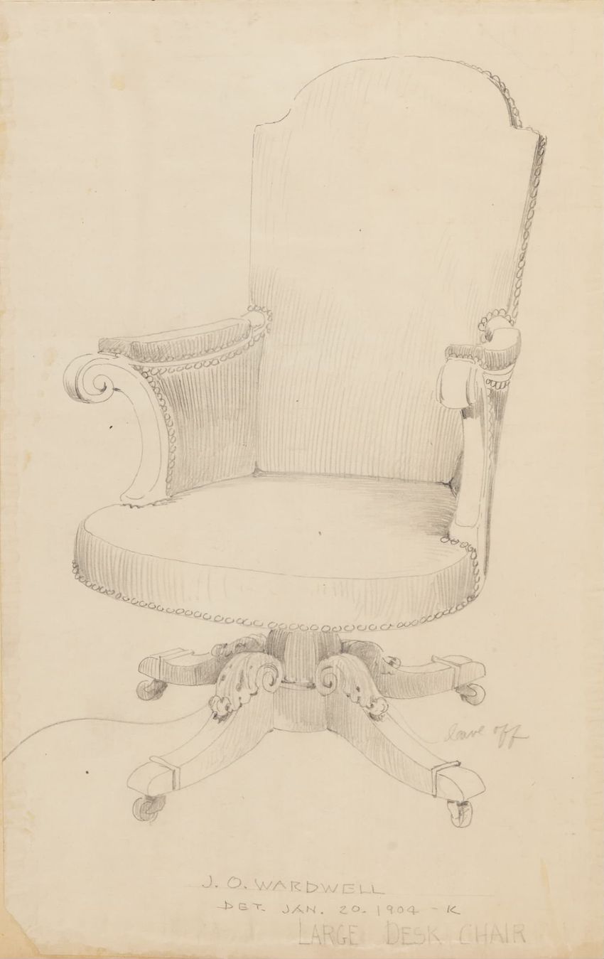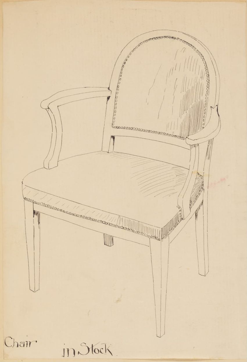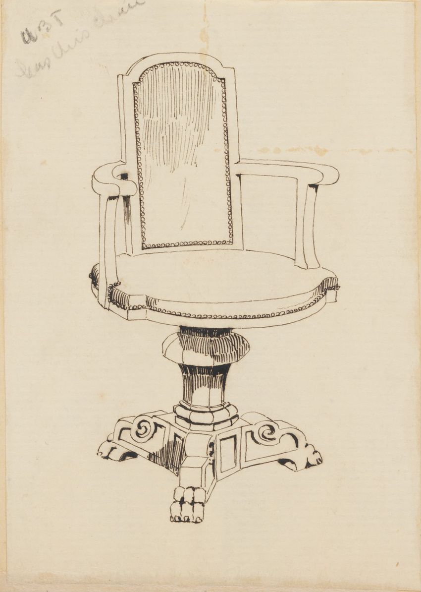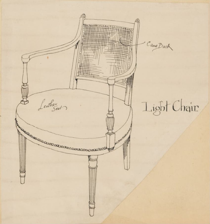 This is a perspective drawing, graphite drawing on paper. It depicts a stone dwelling, three-four stories, featuring three gables and chimneys. The exterior is funished with tall, lean trees and shrubery. A marble, or possibly stone, staircase and handrails line the front of the dwelling.