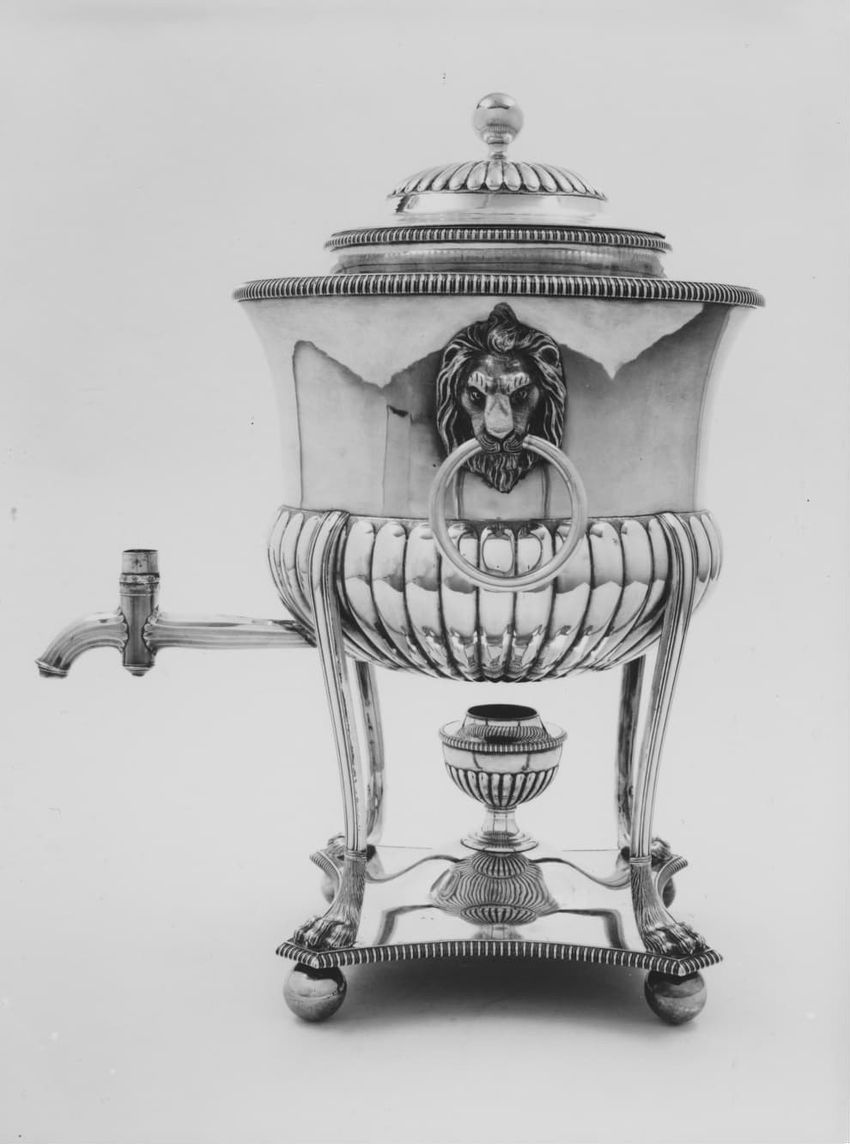 Bulbous body on four applied pierced and curving feet. Engraved and repoussed leaf, floral and medallion pattern on the body. S-curved spout. Domed lid with repousse flowers and leaves. Attached flower and vine finial. Scalloped bale handle applied to the top of the body by leaf terminals. Porcelain...