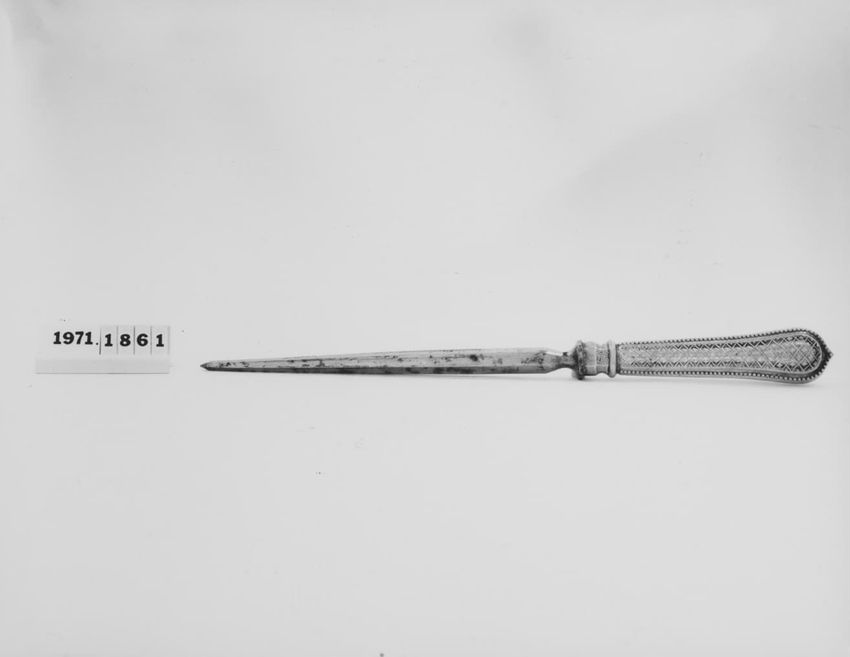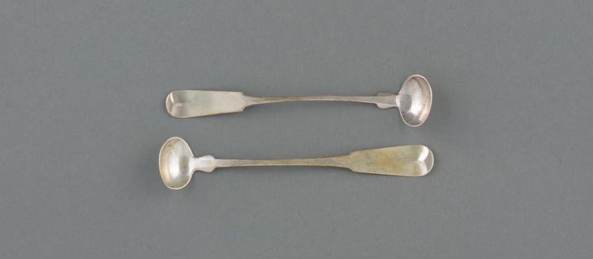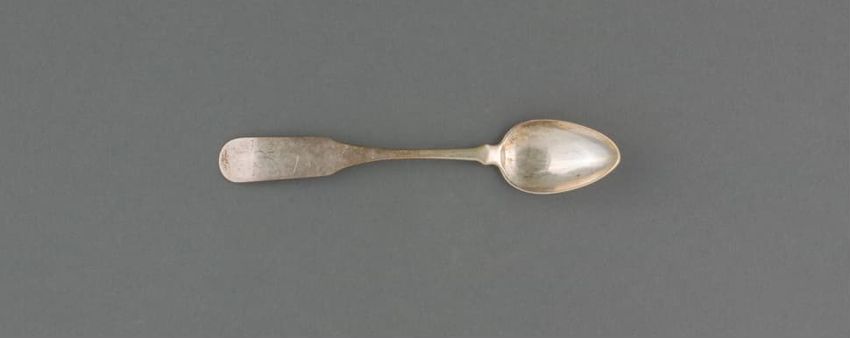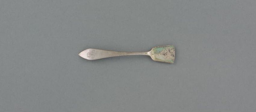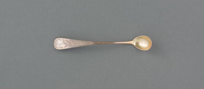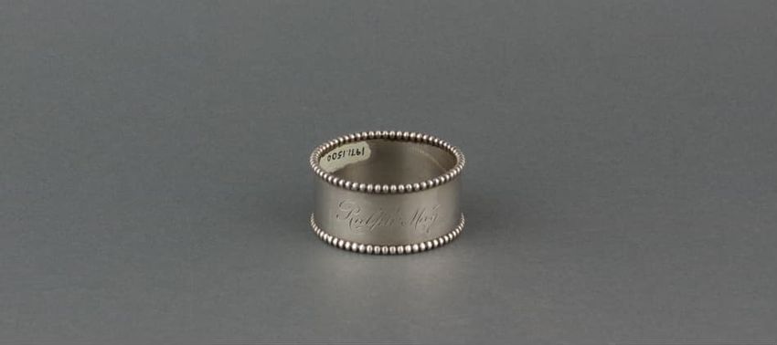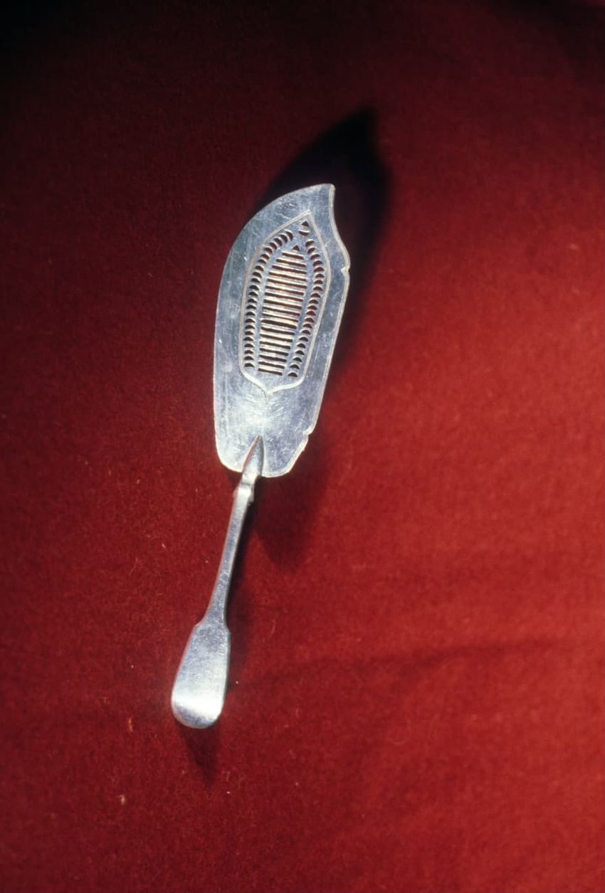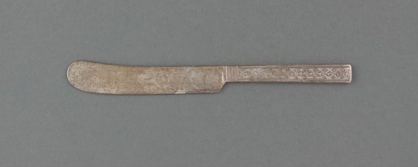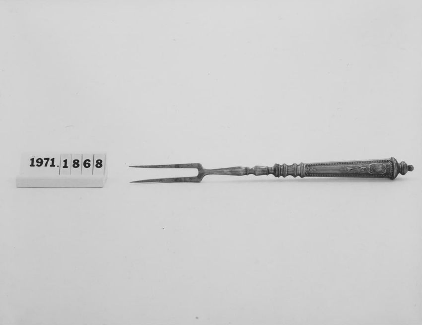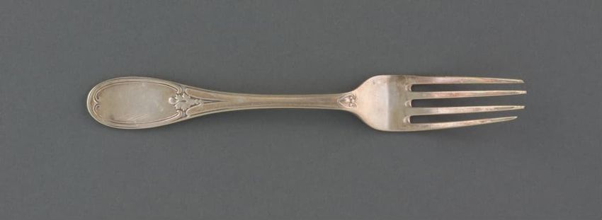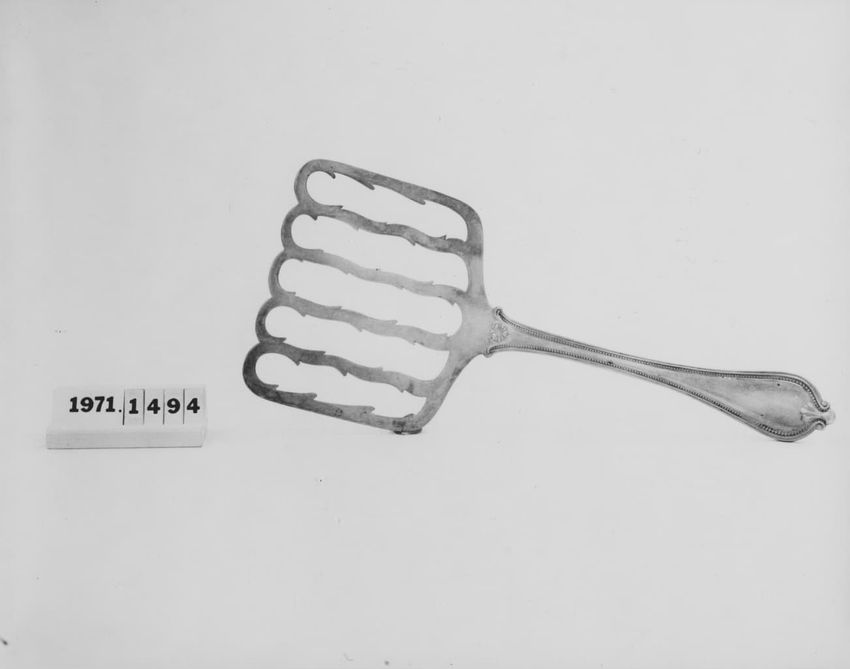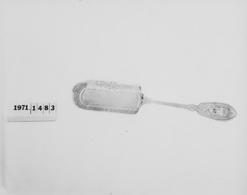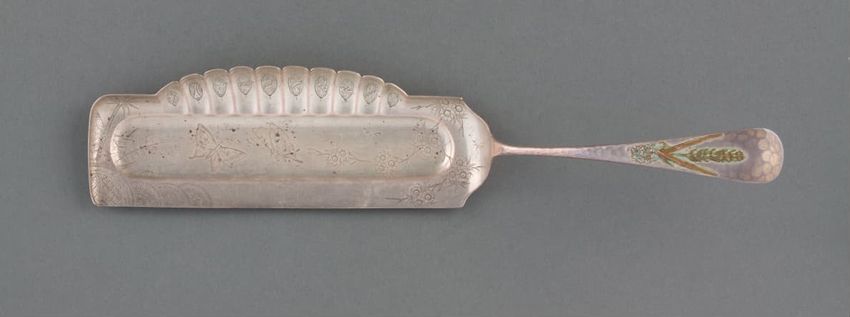 appliqué (technique), casting (process), engraving (printing process), leaf (plant material), foliation (pattern), leaf (metal), nickel (metal), plate (material), piercing, porcelain, repoussé, silver (metal)