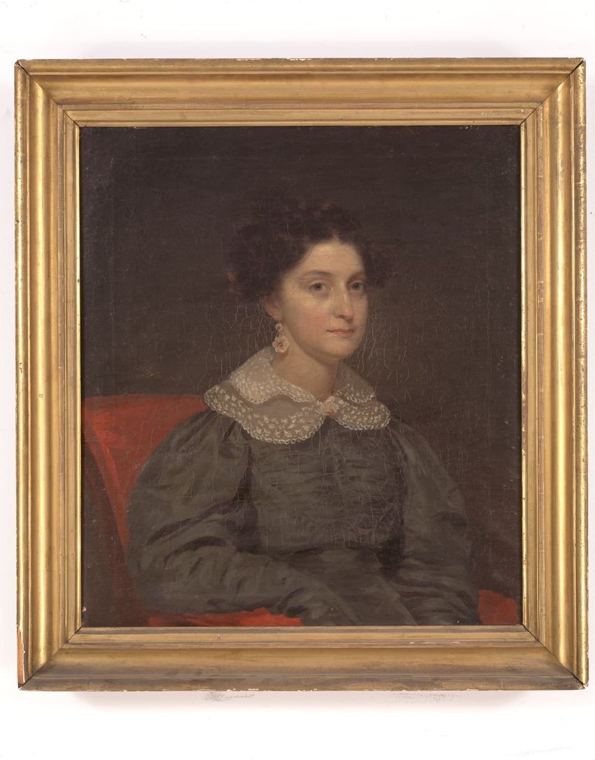 Gray enamelled wood sticks and guards, carved, painted with gold and silver; gray feather leaf with painted central scene of a woman kneeling in prayer at a chapel prie-dieu, in pink, brown, white and green; mother of pearl washers, metal ring with silver cord and gold tassel.