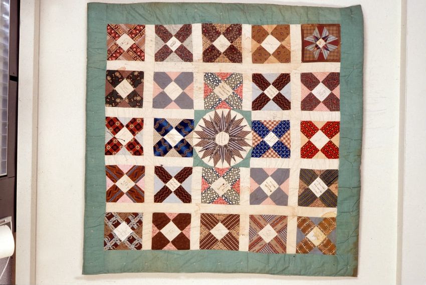 25 block album quilt with central compass rose, both quilted and tufted. Center of each block signed at center in ink. Textiles used are mostly dress fabrics from 1840s and 50s. Cream sashing between each block. Blue border applied around all four sides.