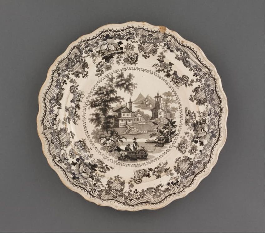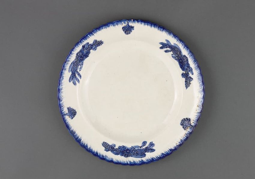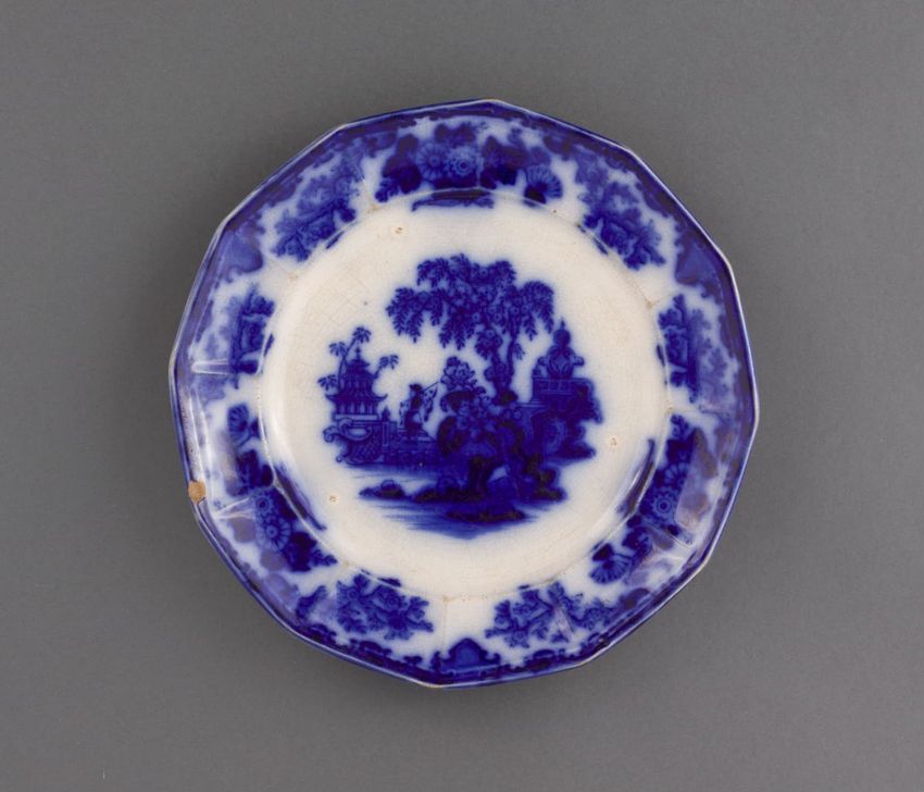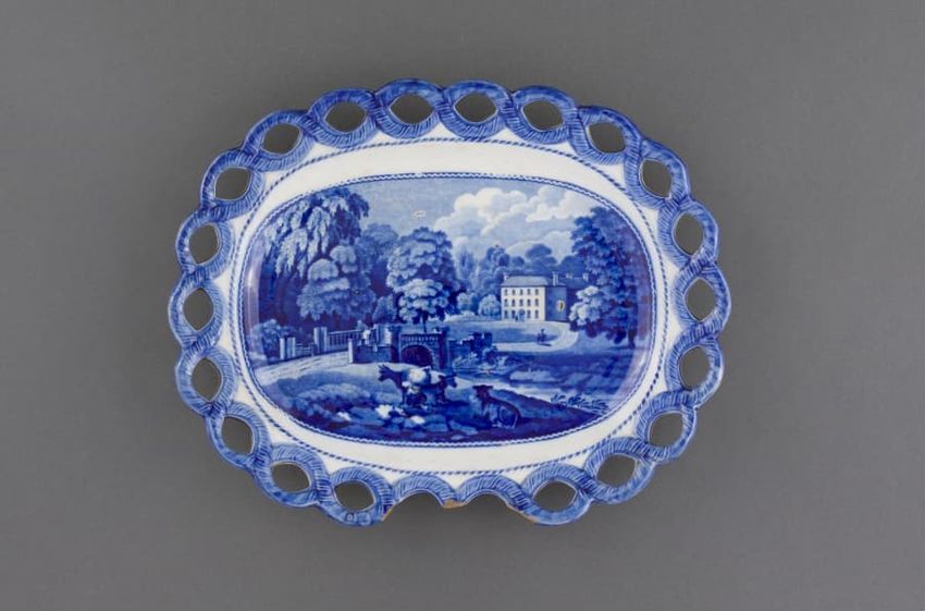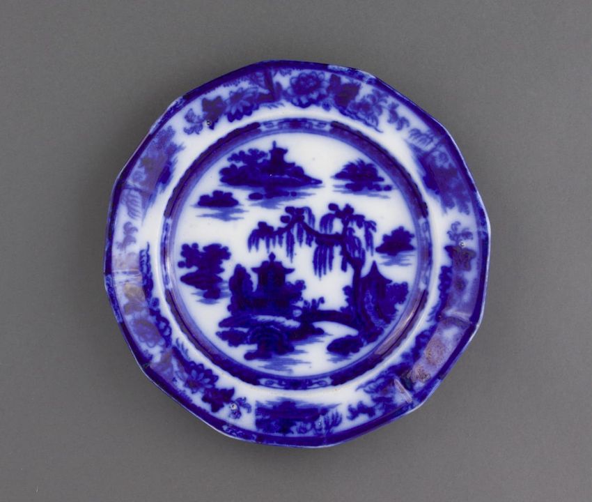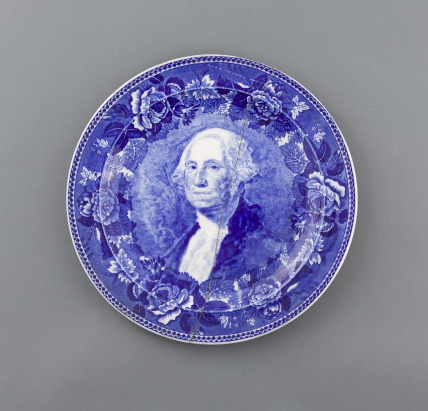 A blue transfer print pearlware plate. The central design is a portrait of George Washington, which is bordered by a floral motif.