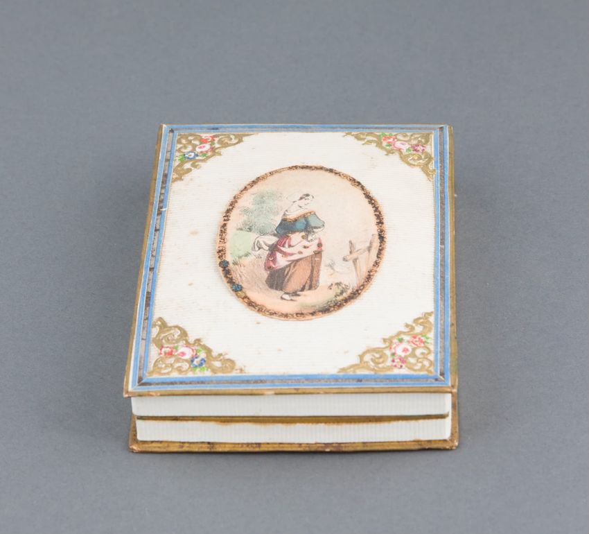 All-over copper lustre w/ dancing couple and scrolls in relief; blue overglaze enamel scrolls; rococo ear-shaped handle; serpentine rim; relief bellflower under spout.