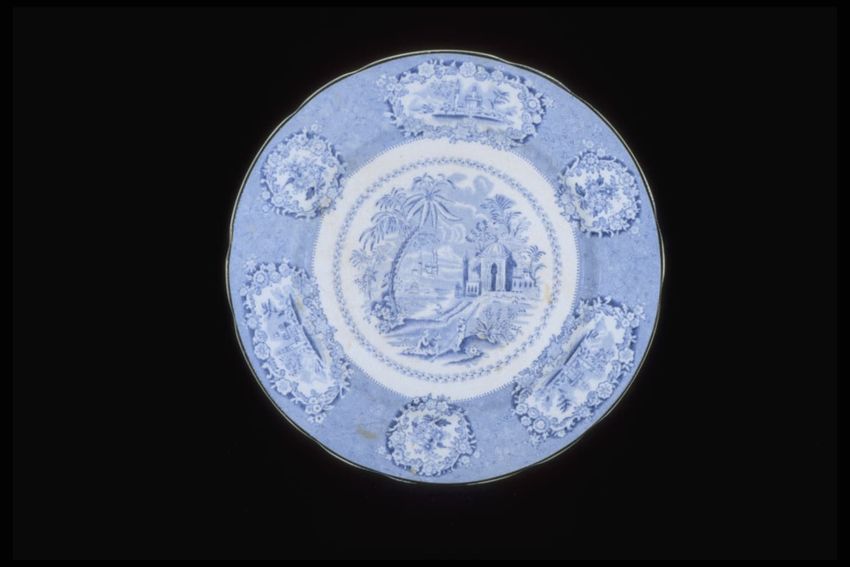 Transfer printed in medium blue w/ an exotic scene of pagoda-like building, bizarre trees and bushes and a camel w/ people in the foreground. This scene is enclosed by a pale blue border w/ delicate flowering vines and 8 floral-edged reserves w/ floral sprays or exotic buildings and greenery. The sc...