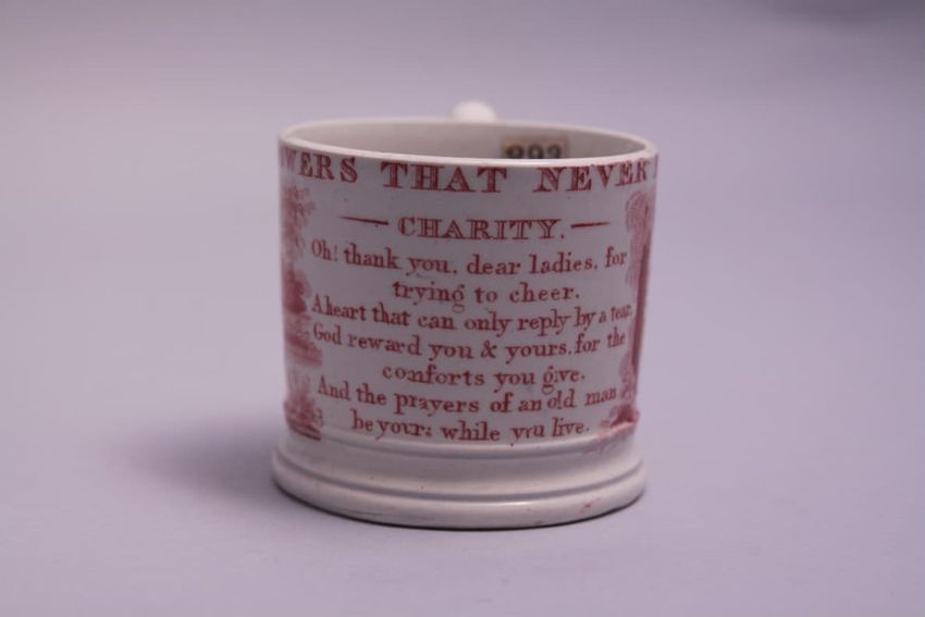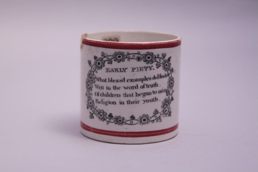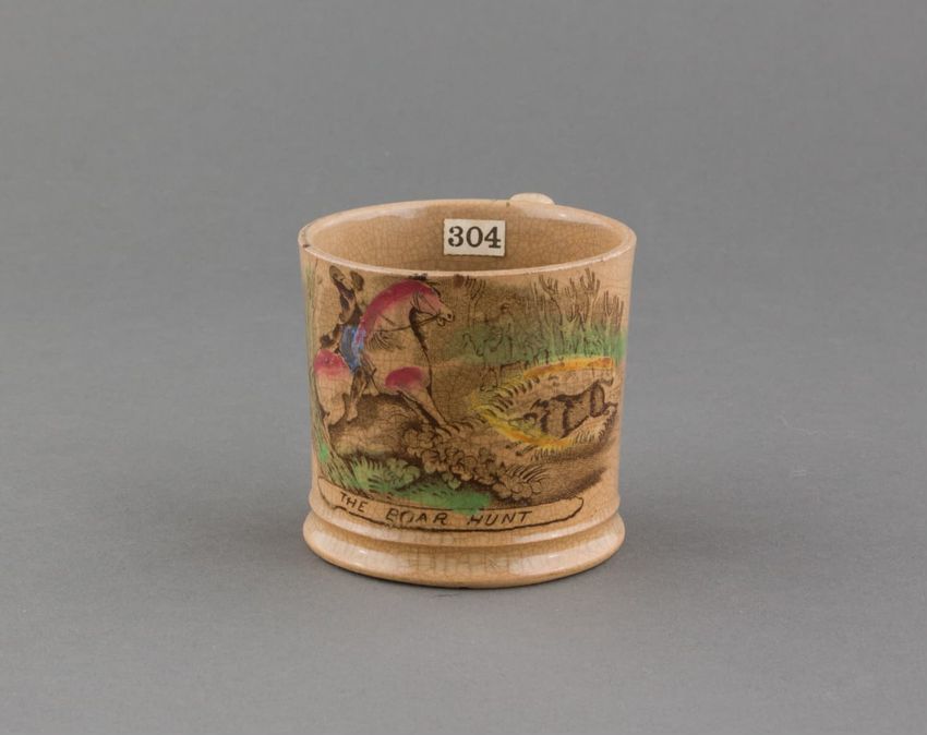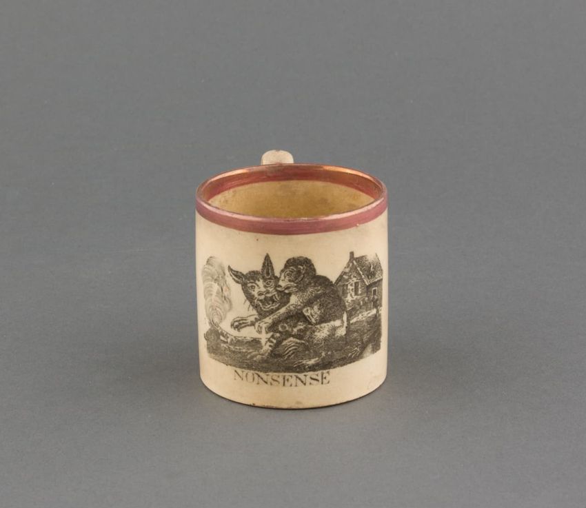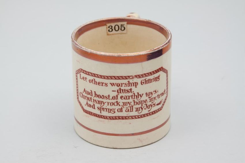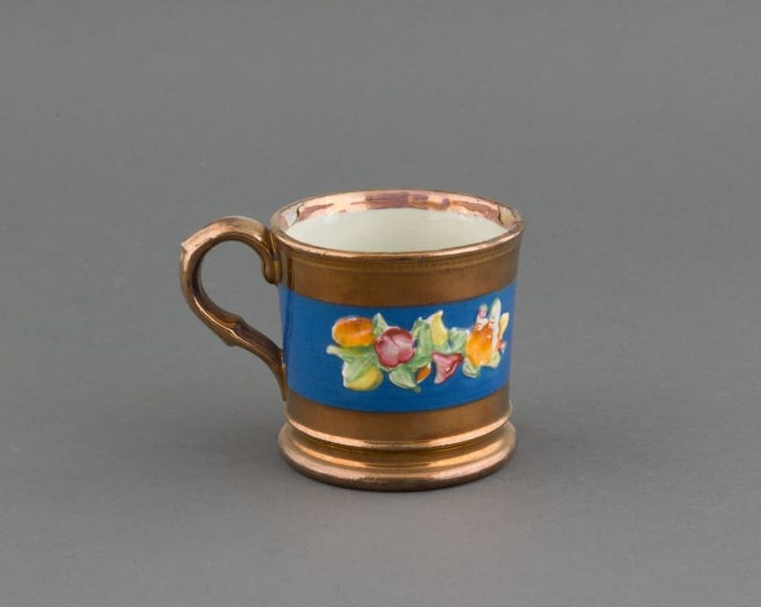 Lusterware mug. Concave body, shaped and beaded base, and spurred loop handle. Copper luster body with mustard orange band around middle and applied floral decoration, overpainted with red, purple, green, blue, and yellow. Inside of mug is beige with pink luster band at rim.
