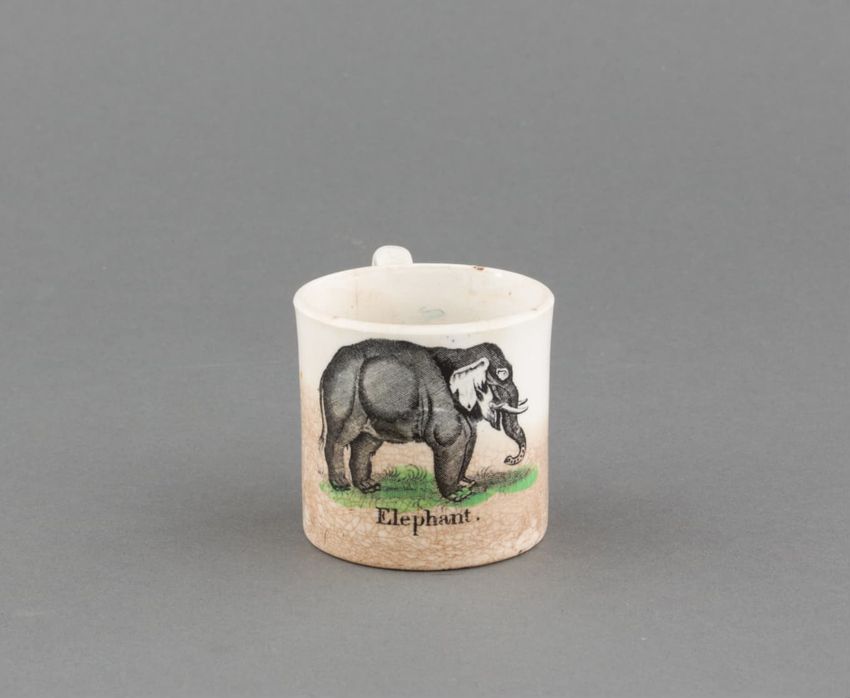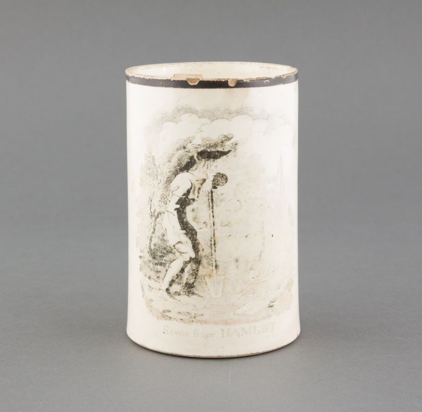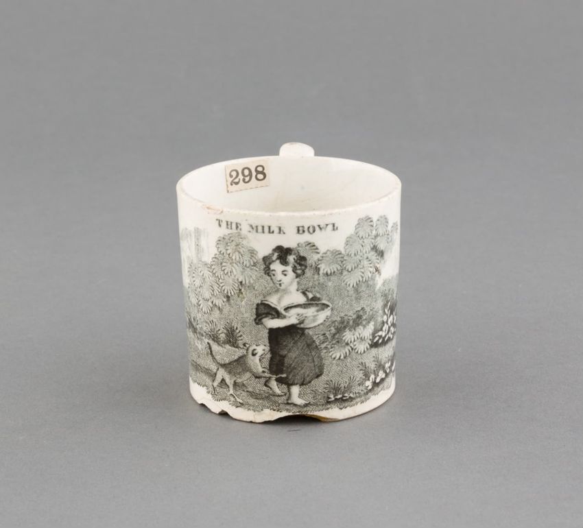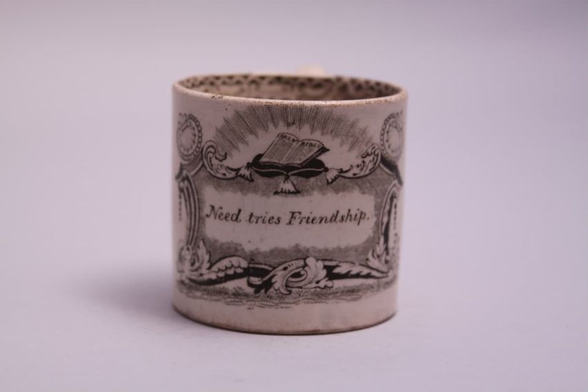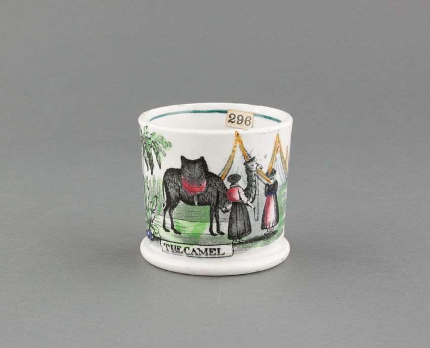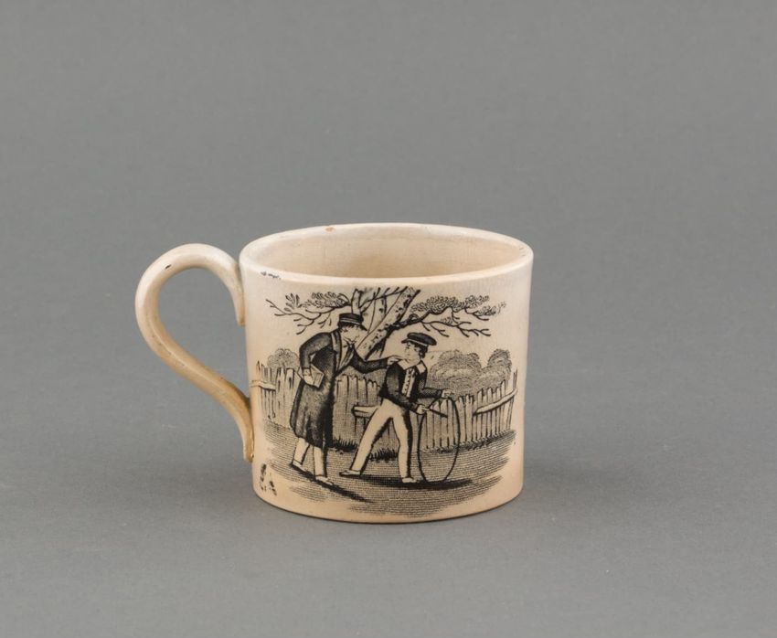 Lusterware mug. Concave body, shaped and beaded base, and spurred loop handle. Copper luster body with mustard orange band around middle and applied floral decoration, overpainted with red, purple, green, blue, and yellow. Inside of mug is beige with pink luster band at rim.