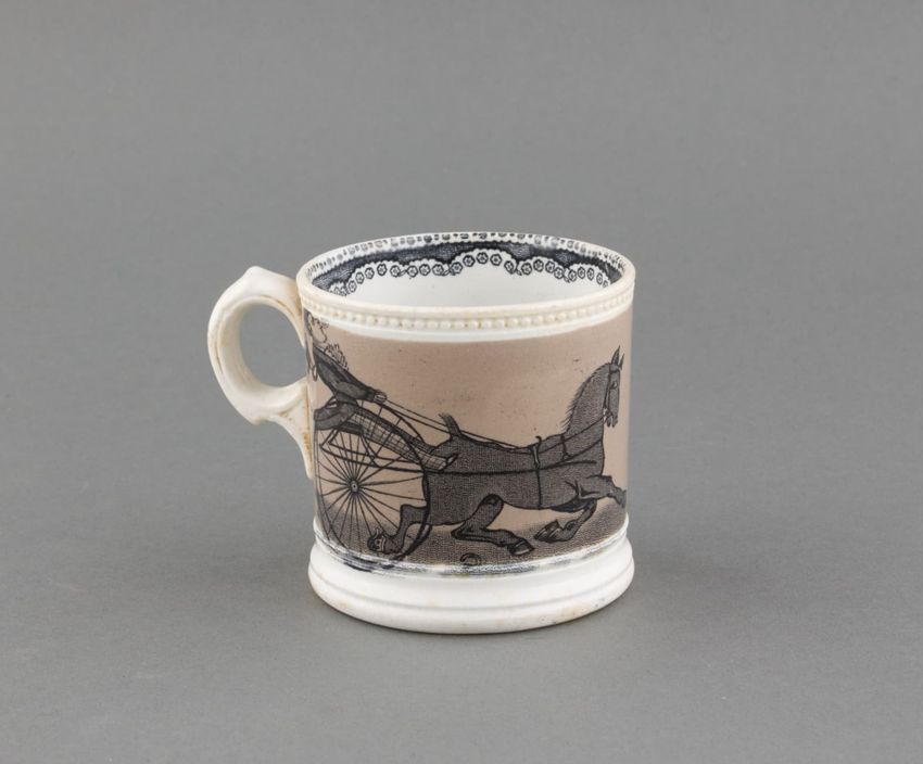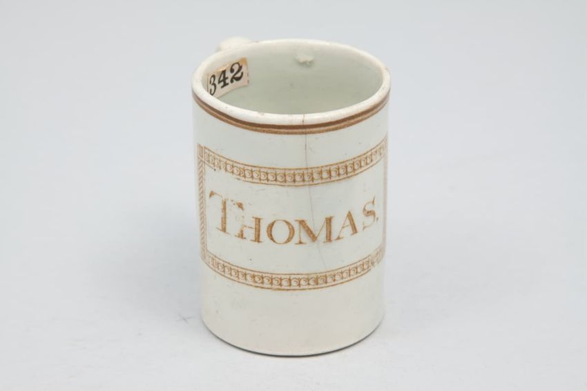 Porcelain mug. Cylindrical with spurred loop handle. Wide band of yellow at base with scalloped edge. Floral swags in blue, red, green, yellow, pink, purple, and white. Gold luster lines along scalloped edge, around rim, and down handle.