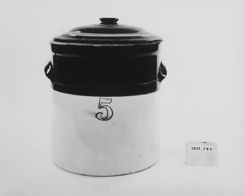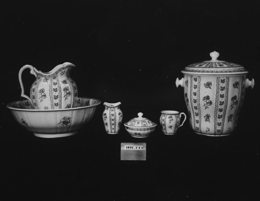 Squared mahogany veneered body with yellow painted diamond shaped escutcheon, fitted with a mirror in lid, shelf and pin cushion; interior lined with pink, orange and red paper; contains assorted sewing accessories, needles in packages, thread, pins, thimbles, beeswax, fasteners; also contains thimb...