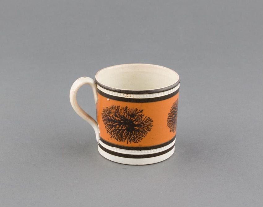 Lusterware mug. Concave body, shaped and beaded base, beaded rim, and spurred loop handle. Copper luster with yellow band around middle and applied floral decorations, overpainted with green, yellow, blue, red, and pink. Interior of mug coated in luster.