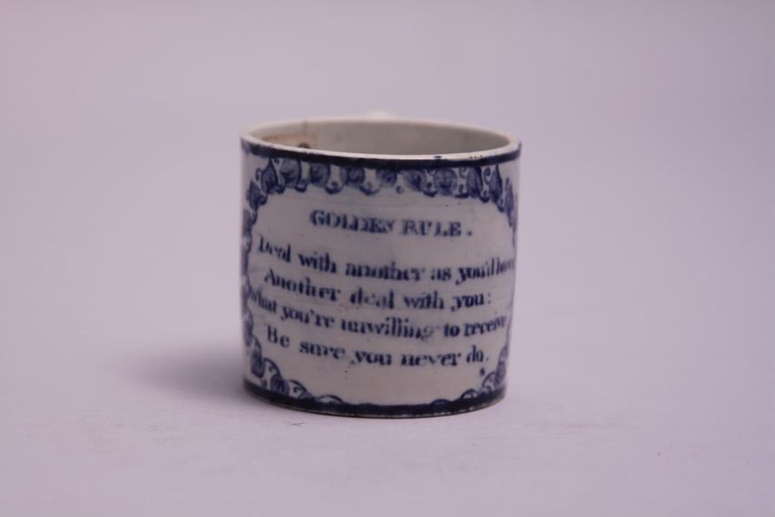 Earthenware mug. Shaped and reeded base with loop handle. Blue transfer printed design with angels in oval reserves, flags, swords, a dove, a drum, a horn, and a harp. Blue decorative border on inside of rim, and blue transfer stripe on handle.