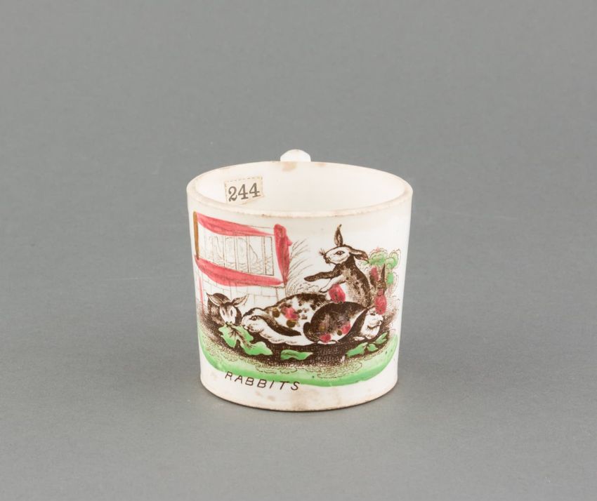 Earthenware children's mug. Cylindrical with loop handle and leaf terminals. Brown transfer printed image of several rabbits in front of a hutch. Overpainted with green and red.