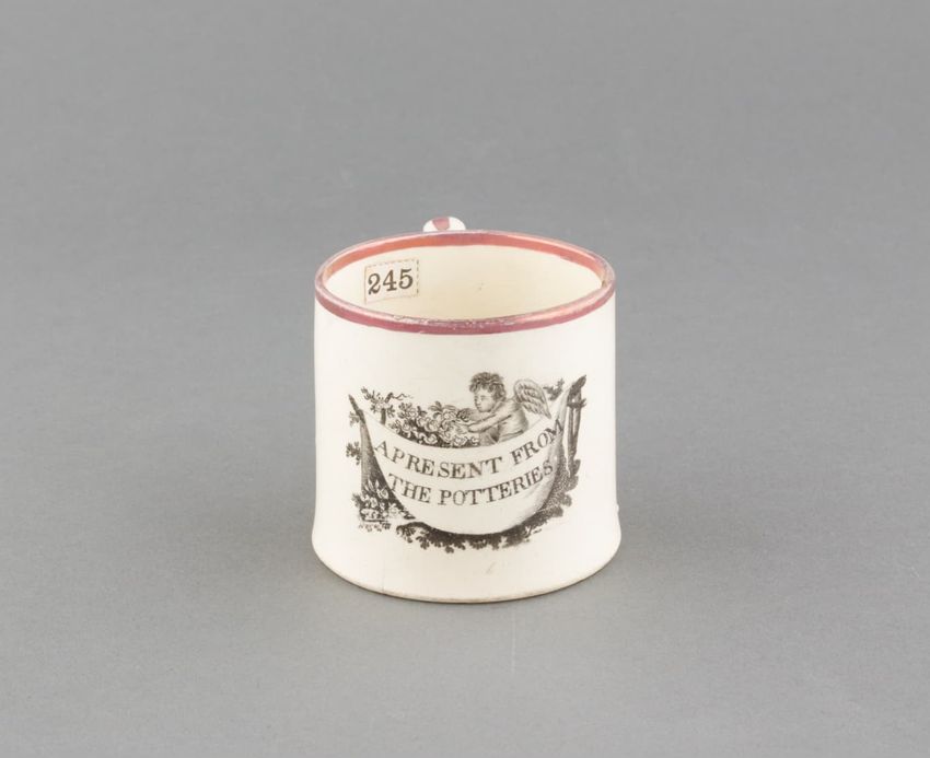 Earthenware children's mug. Black transfer printed design with a cherub and a swag that reads "A present from the potteries." Pink lustre at rim and down handle.
