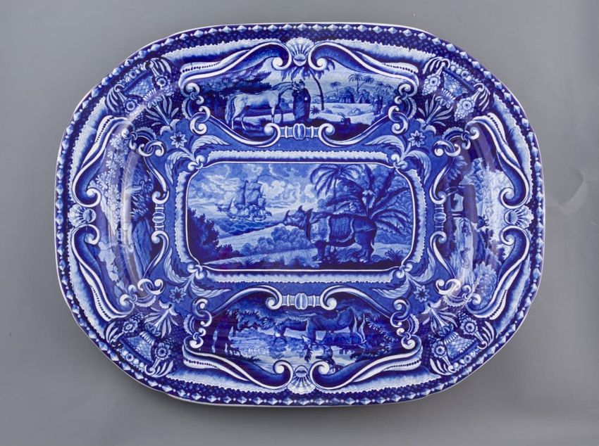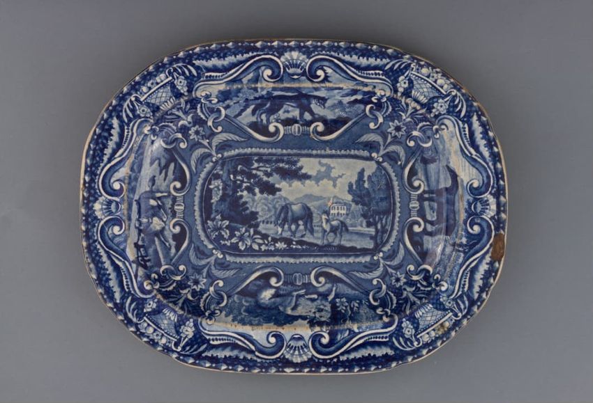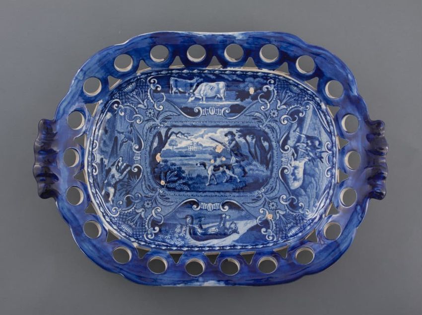Blue, transfer-print pearlware platter. Circular and triangular cut-out border, fluted scroll handles; inner border of four scenic cartouches: cows, goats, leopard, spaniel chasing duck; all separated by stalks of flowers; central scene of man hunting w/ spaniel.