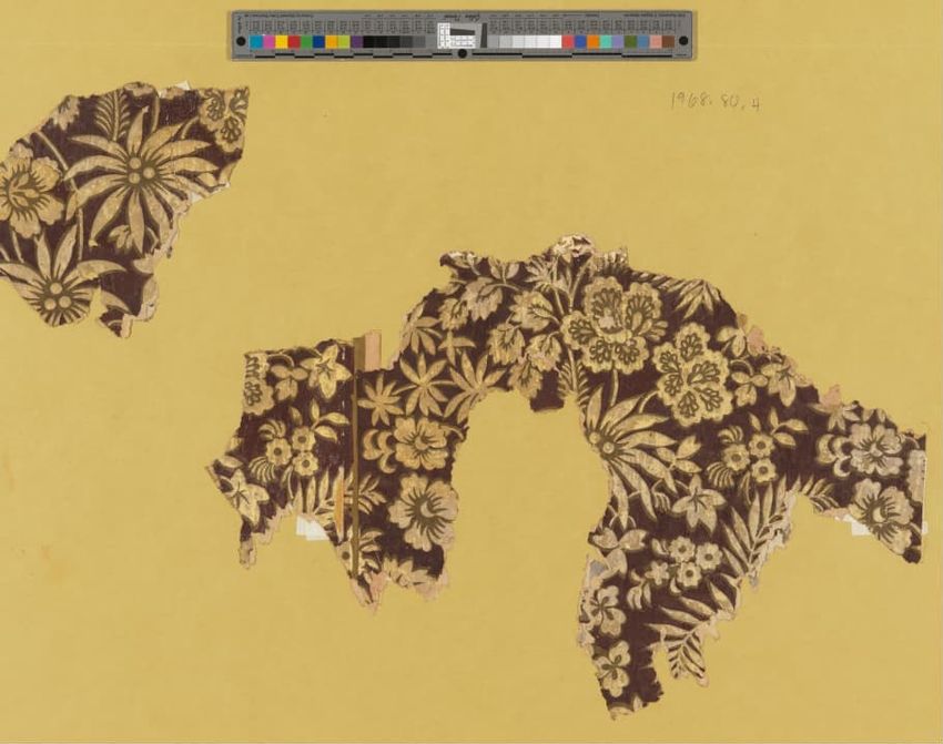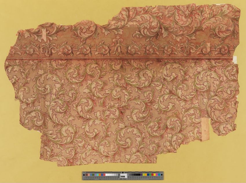 Six fragments from the third layer of wallpaper removed from the second floor right rear room of the Shirley-Eustis House, Roxbury, Massachusetts. Floral wallpaper roller-printed in yellow, cream, pink, blue, red, and white on olive ground.