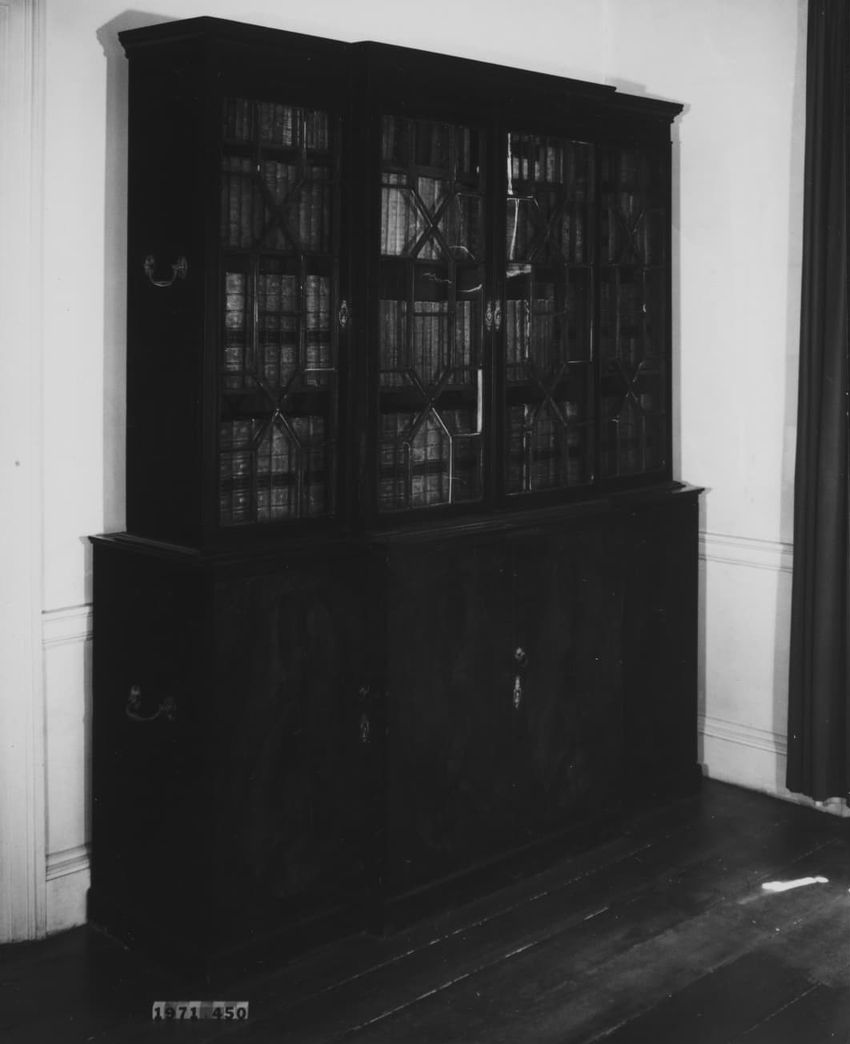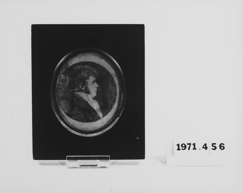 Black and white engraving of a scene from Shakespeare's King Henry the Fourth set in Boar's Head Tavern; Henry, standing to the left, is addressing Falstaff, sitting to the right; four other figures in background; molded pine frame with gilt and gesso on front.