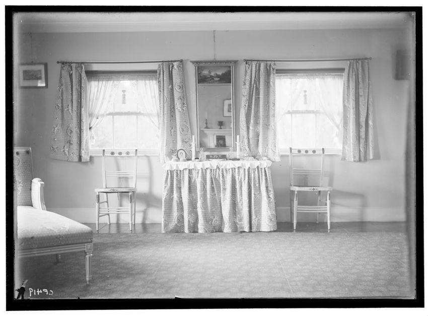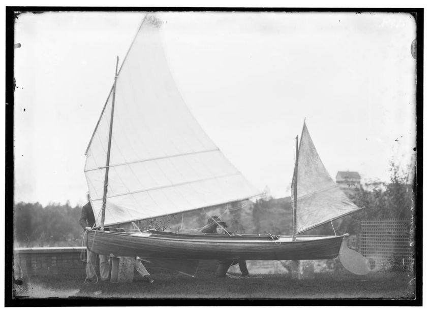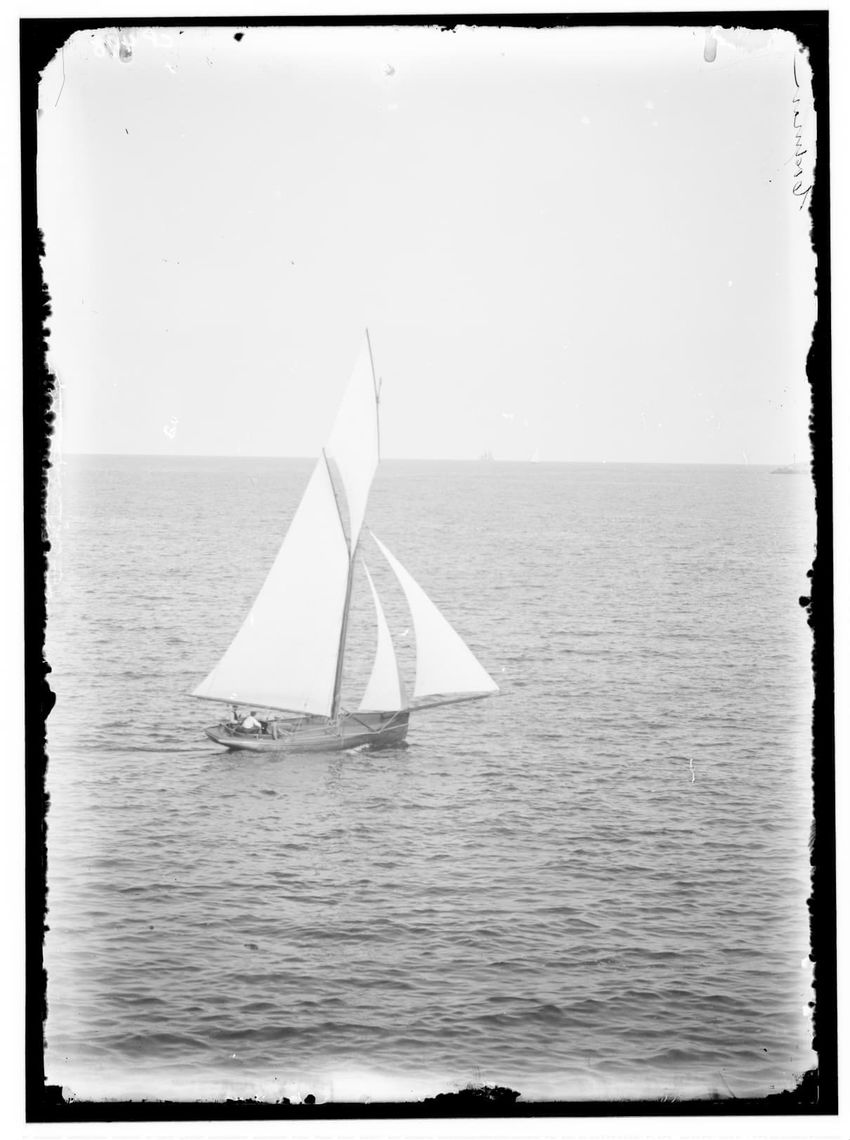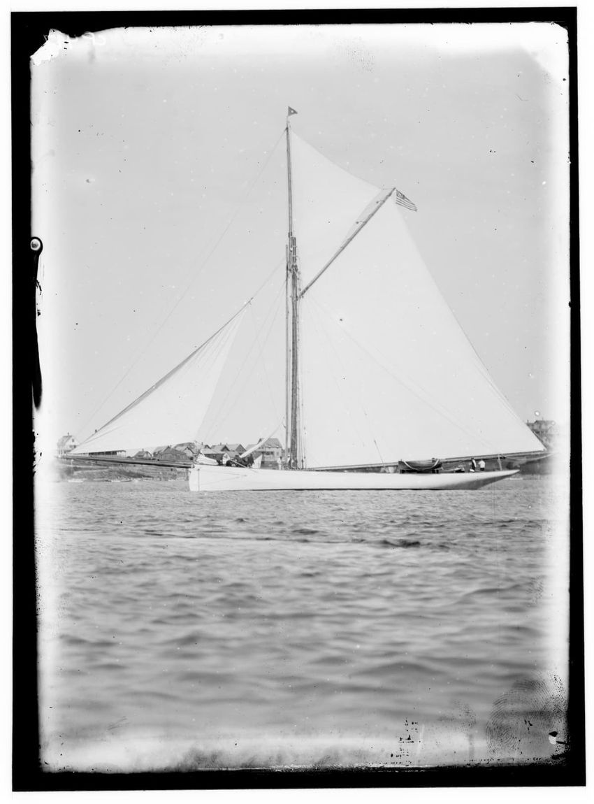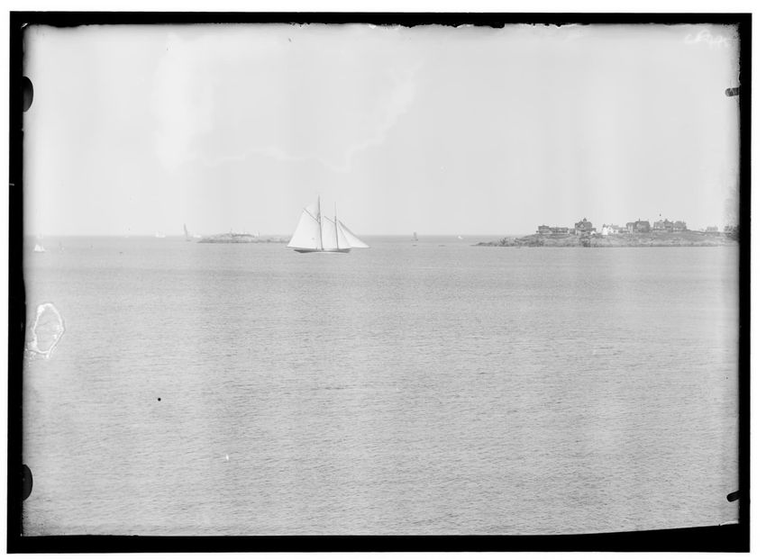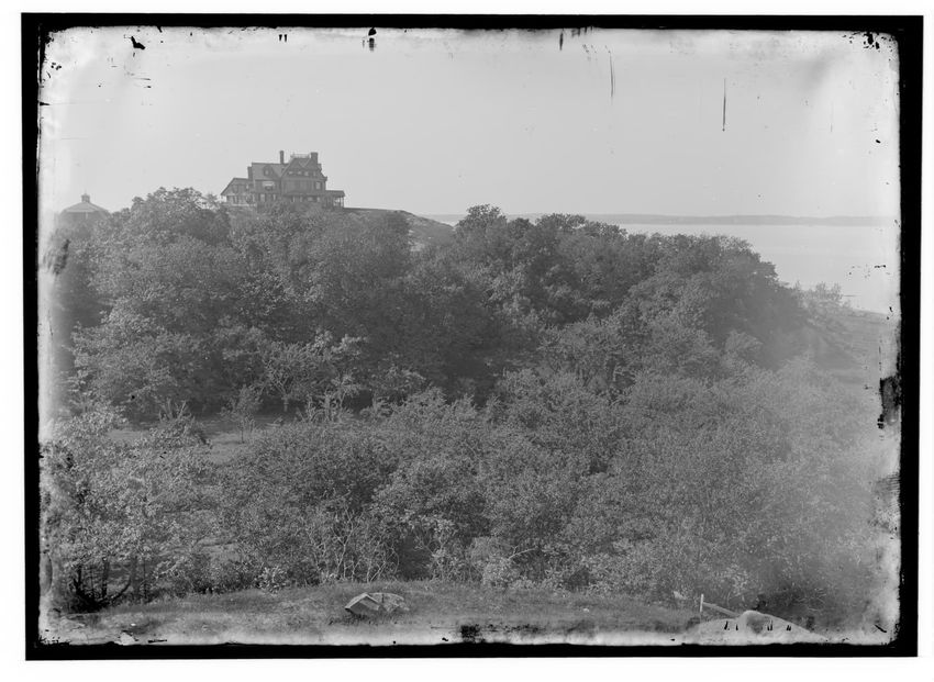 The image presents a panoramic view of Bar Harbor, Maine. In the foreground, several trees are visible, with a large tree prominently positioned in the center. The background features a townscape with numerous buildings, including some multi-story structures, set against the backdrop of the harbor a...